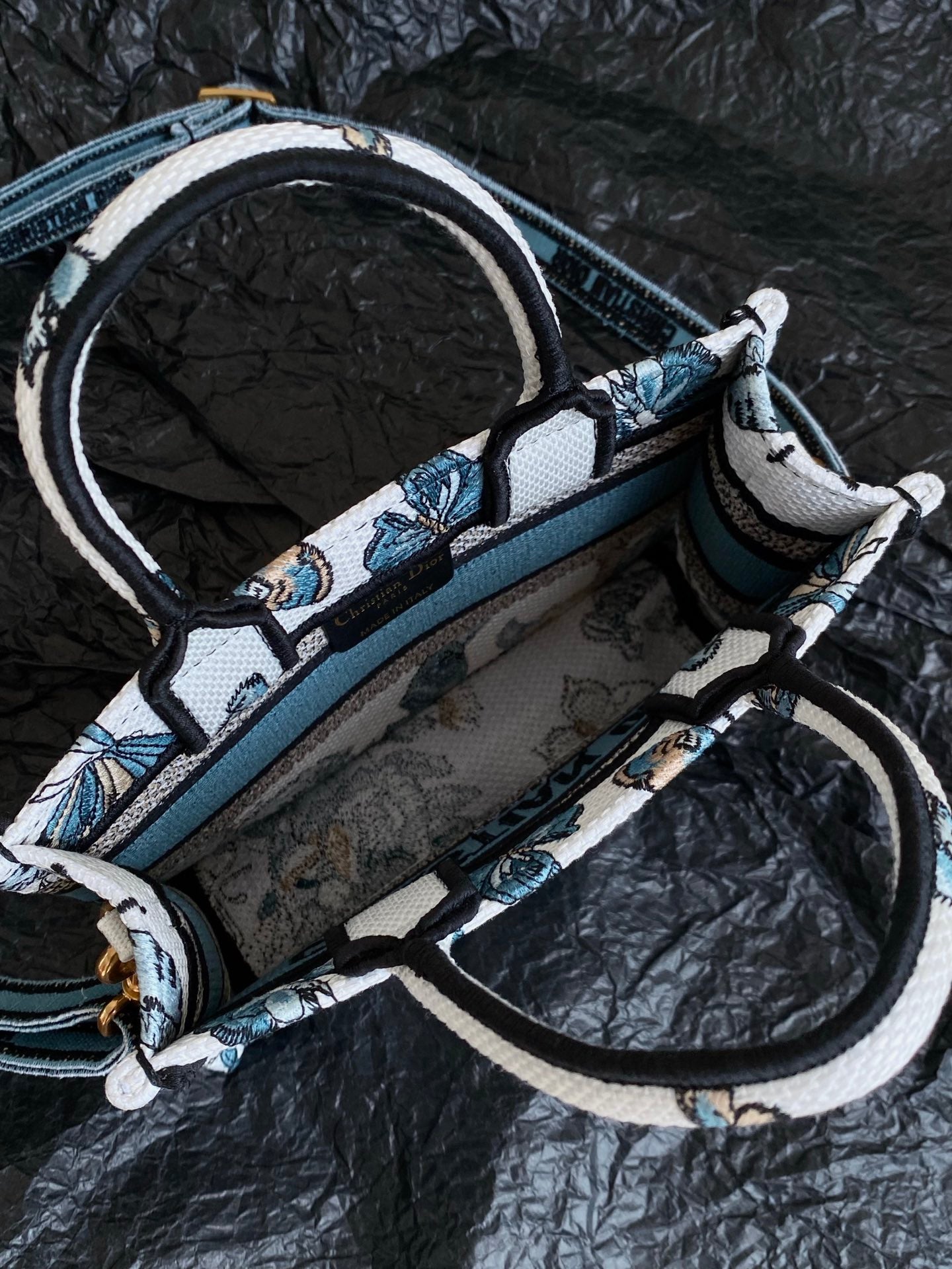 MINI BOOK TOTE 21 BUTTERFLY PATTERN BLUE CALFSKIN