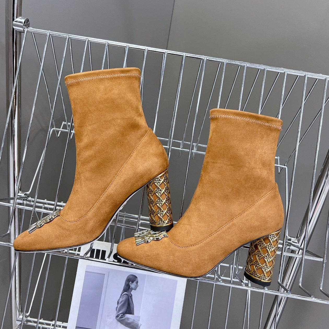NAUGHTILY-D HEELED ANKLE BOOT IN BISQUE BEIGE CANNAGE MOTIF MESH AND SUEDE 8 CM