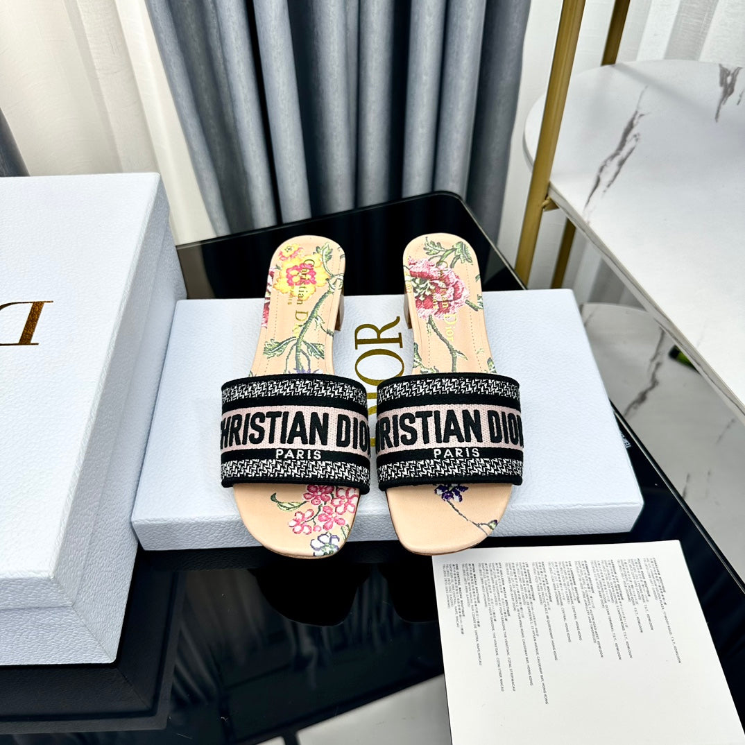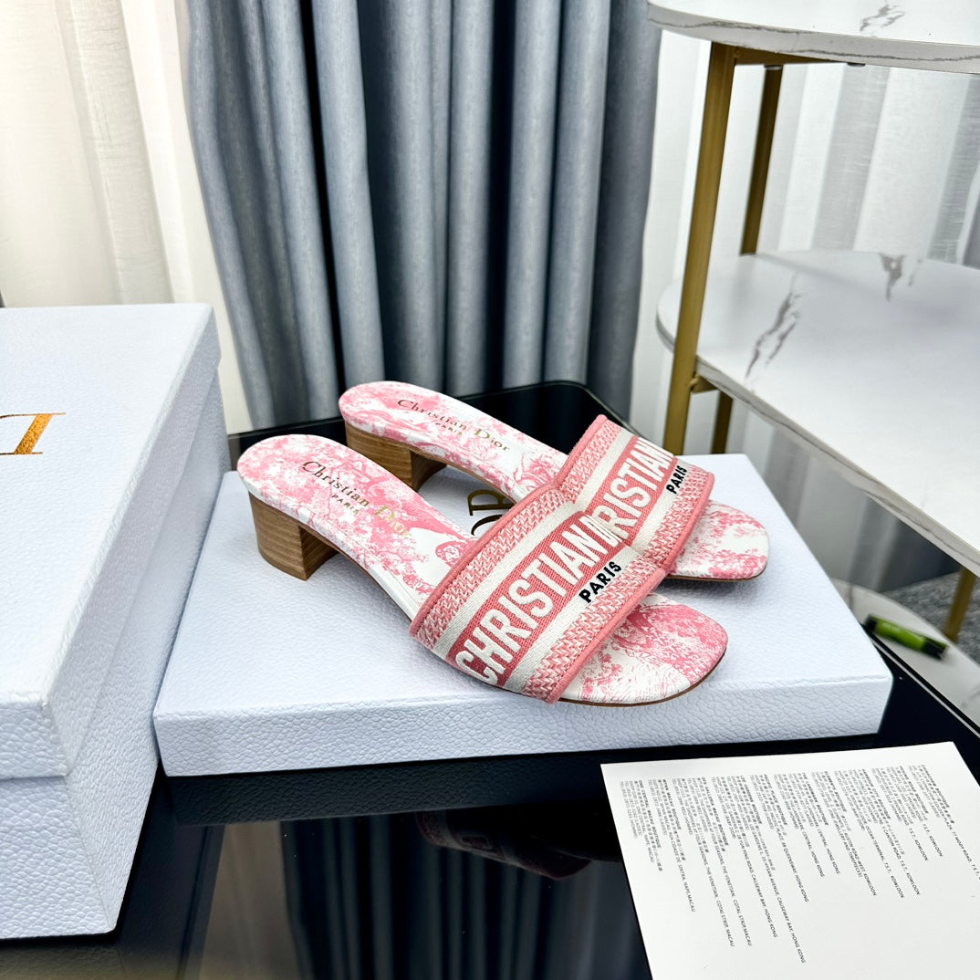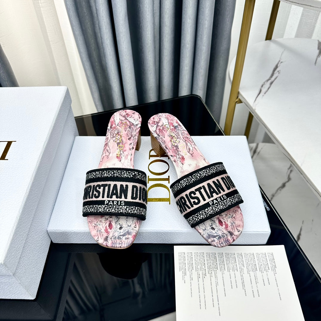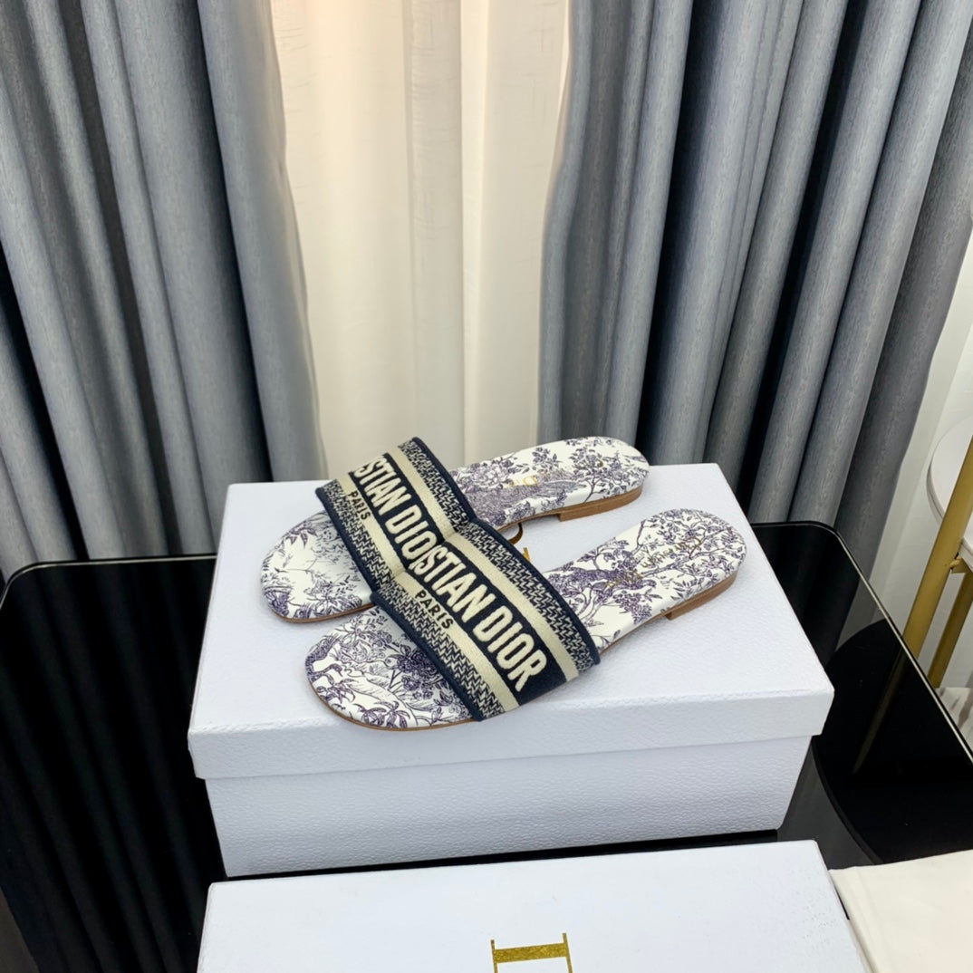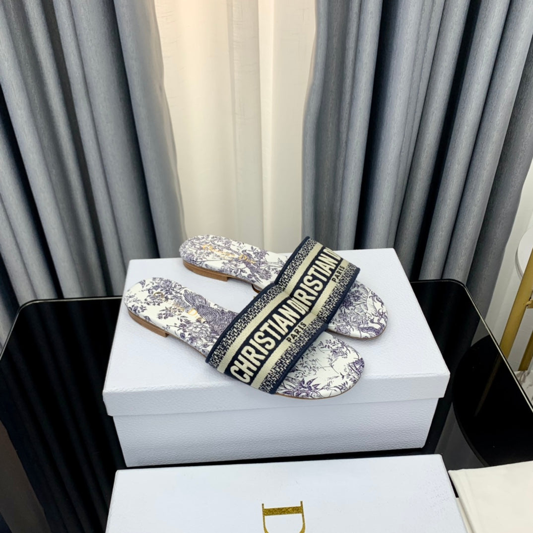 DWAY HEELED SLIDE EMBROIDERED COTTON AND NAVY BLUE MISS DIOR ALLOVER MOTIF 35 MM