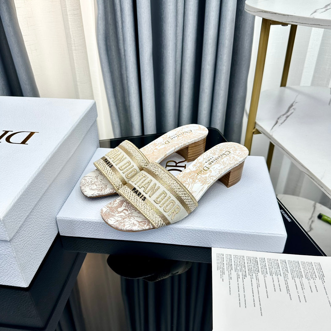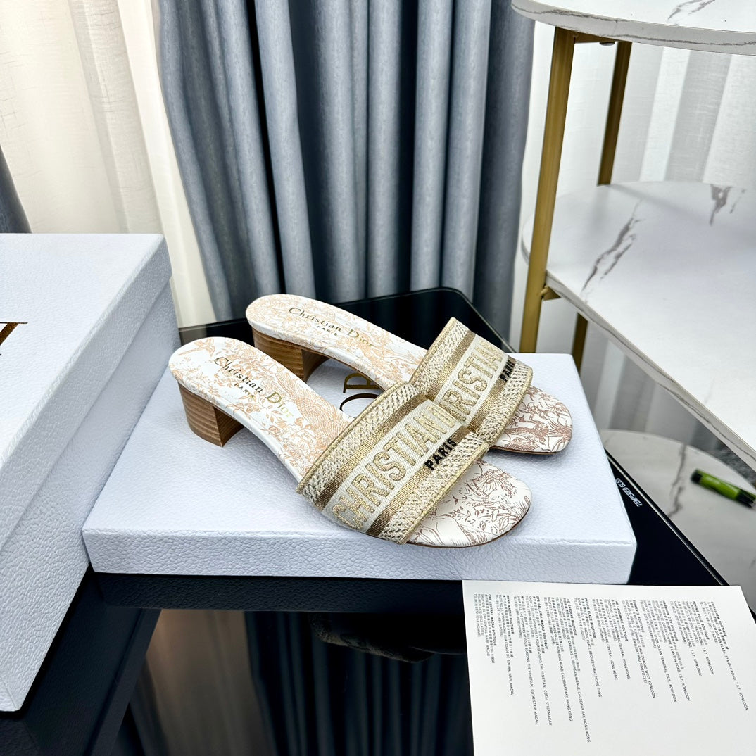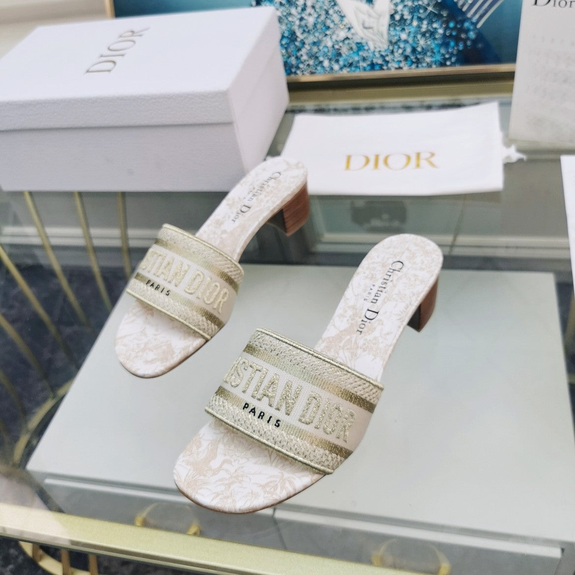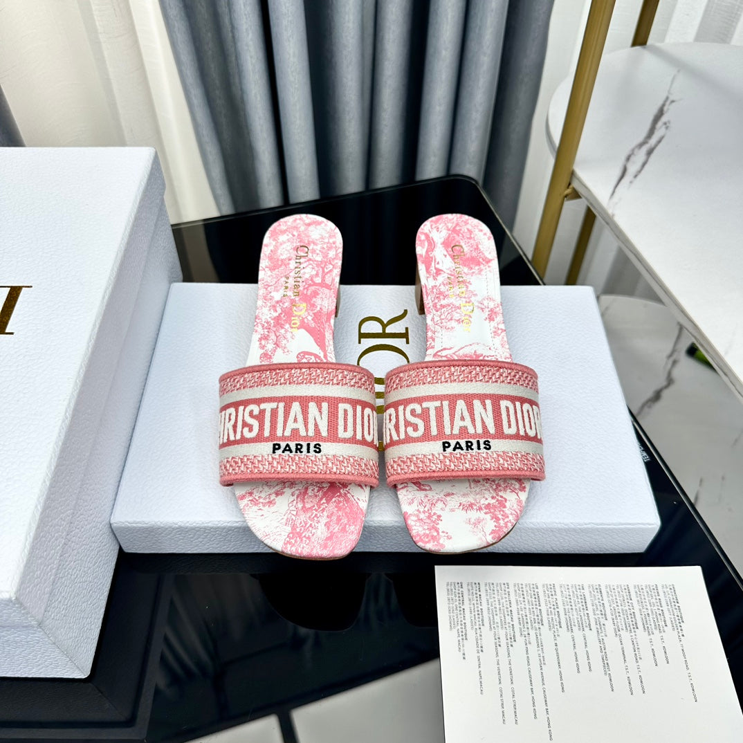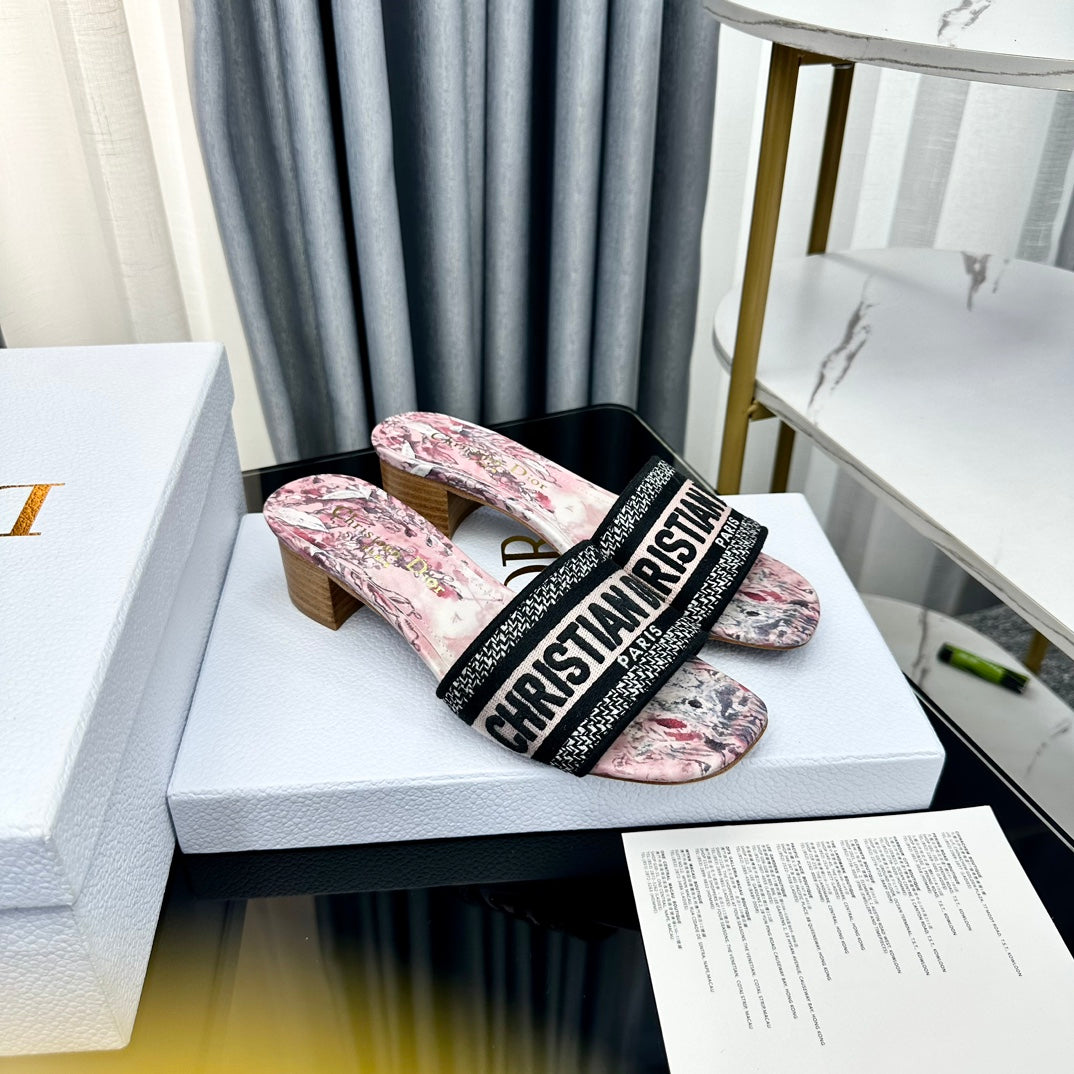DWAY HEELED SLIDE EMBROIDERED COTTON AND NAVY BLUE MISS DIOR ALLOVER MOTIF 35 MM