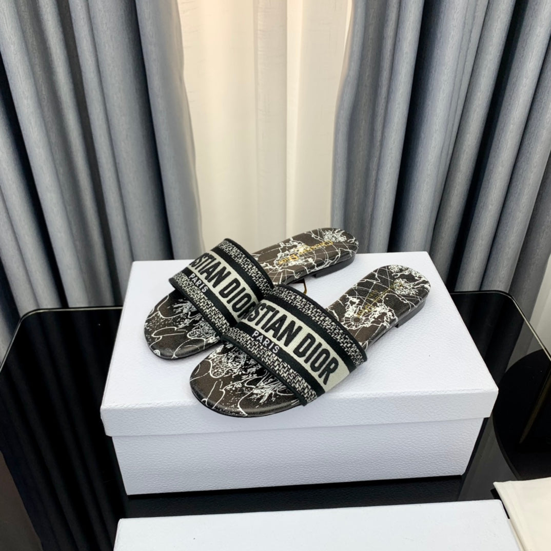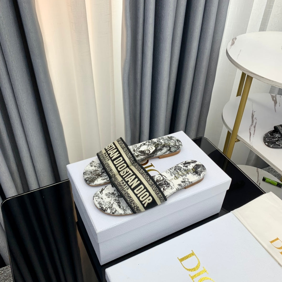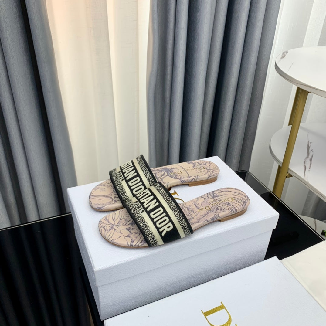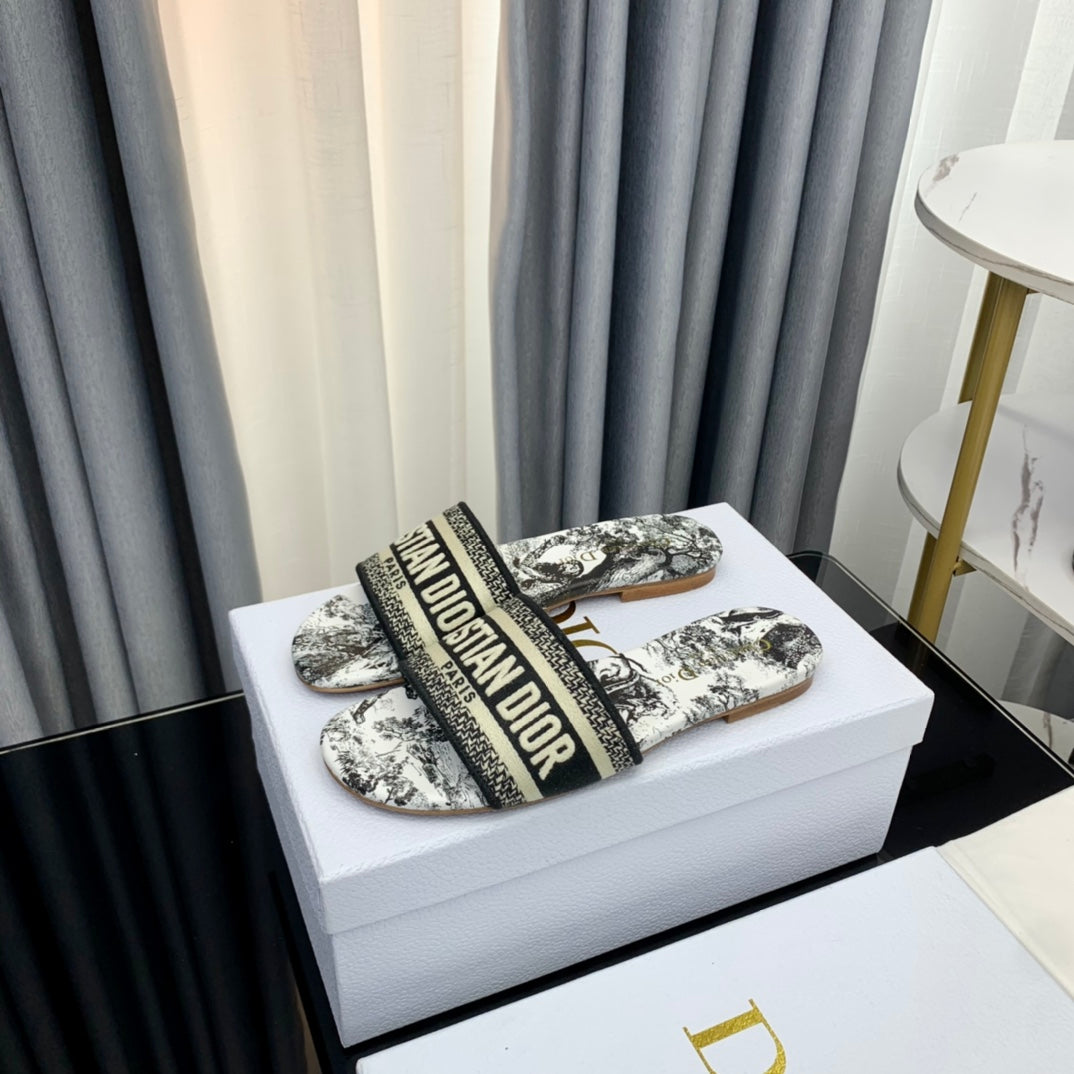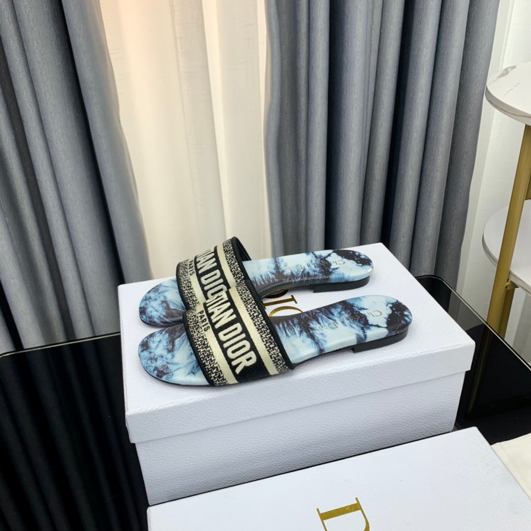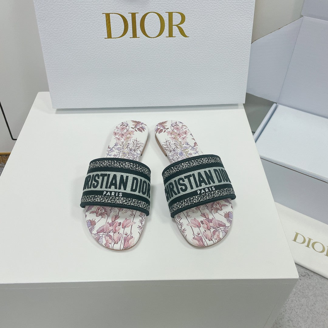 DWAY HEELED SLIDE EMBROIDERED COTTON AND NAVY BLUE MISS DIOR ALLOVER MOTIF 35 MM