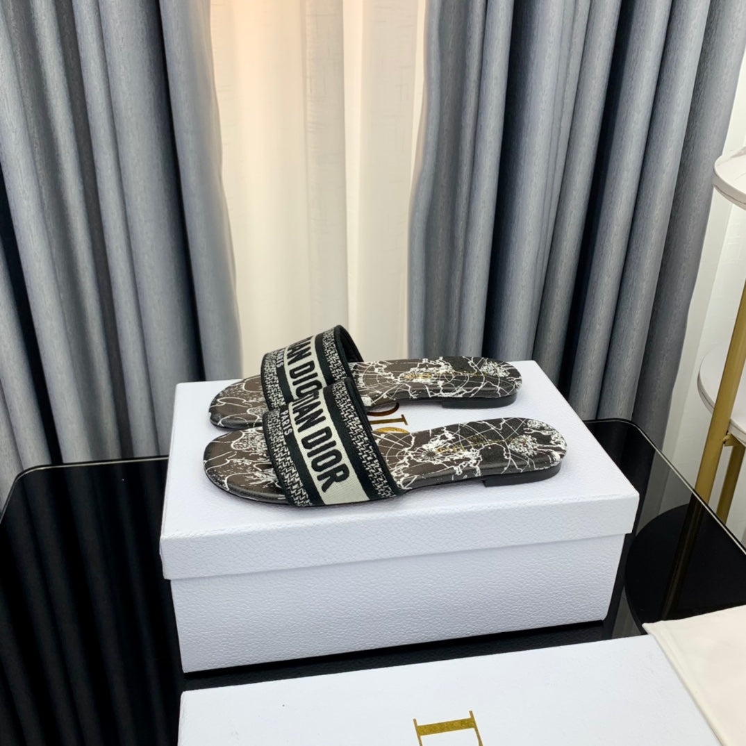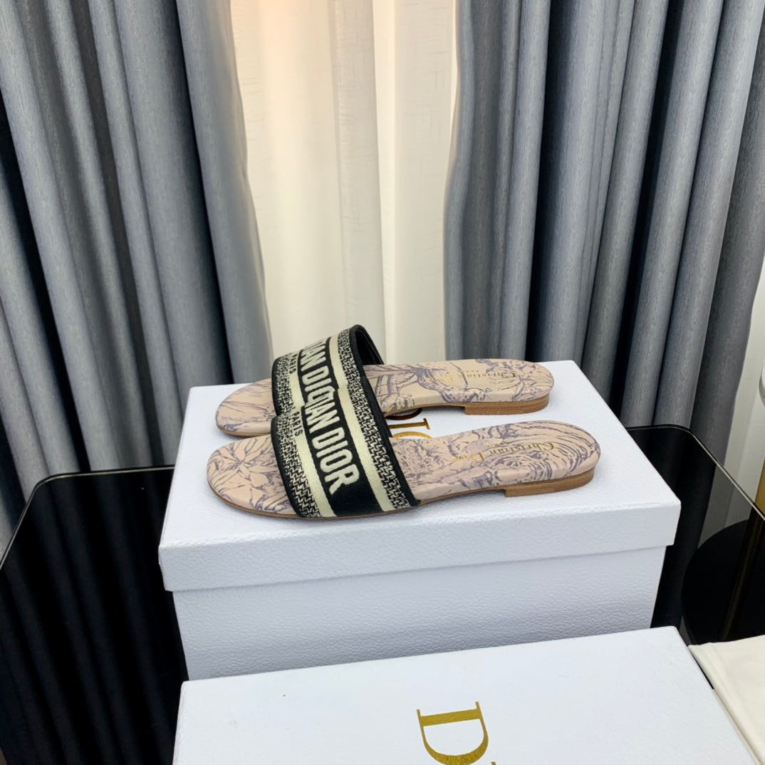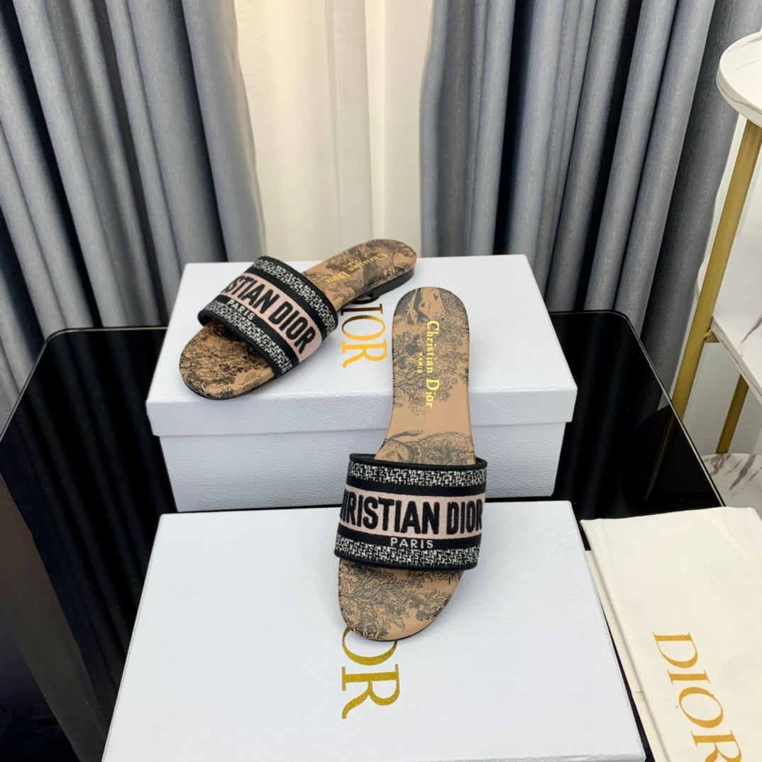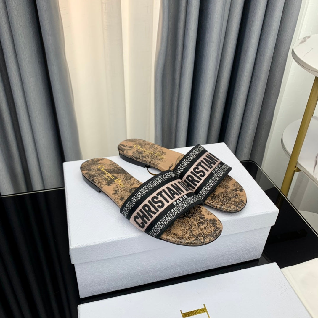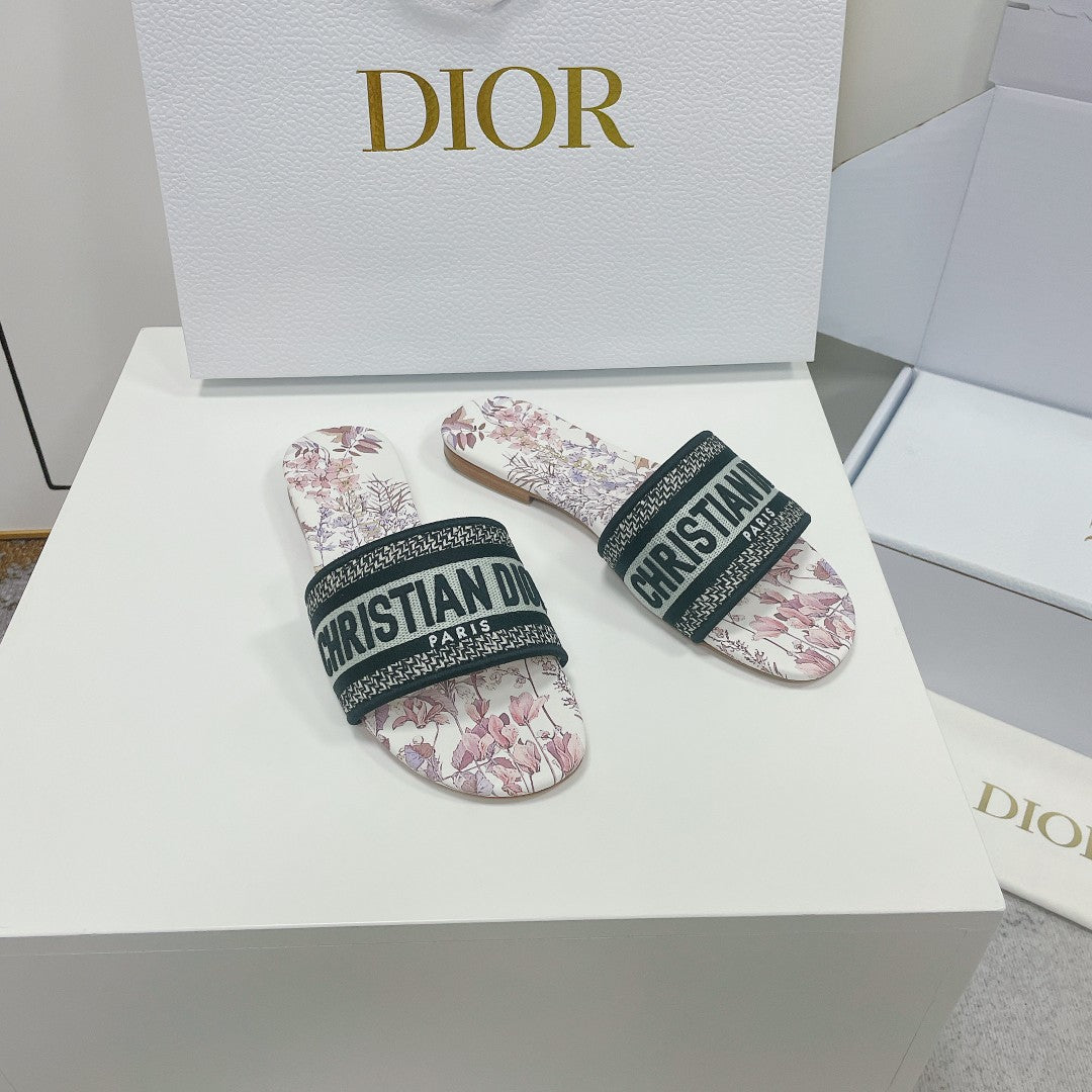 DWAY HEELED SLIDE EMBROIDERED COTTON AND NAVY BLUE MISS DIOR ALLOVER MOTIF 35 MM
