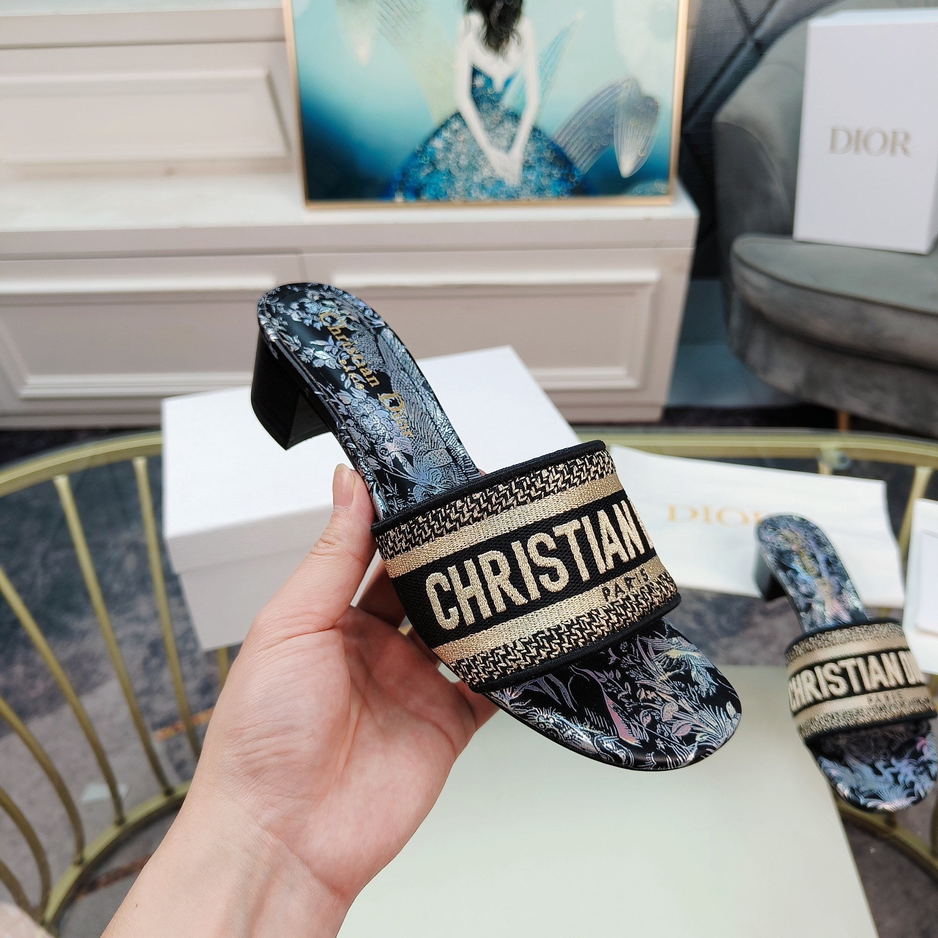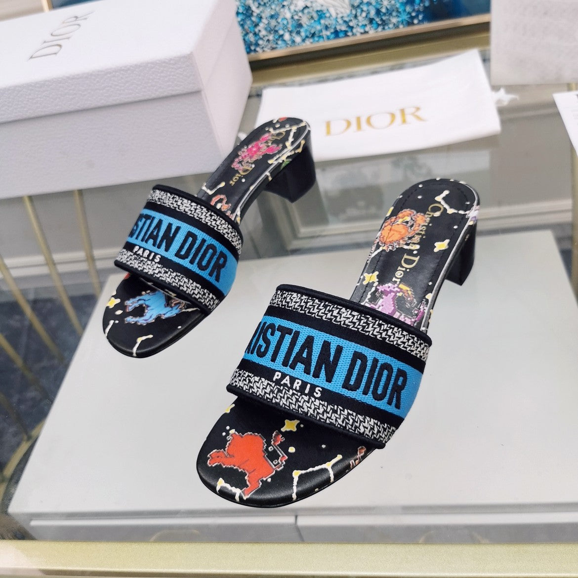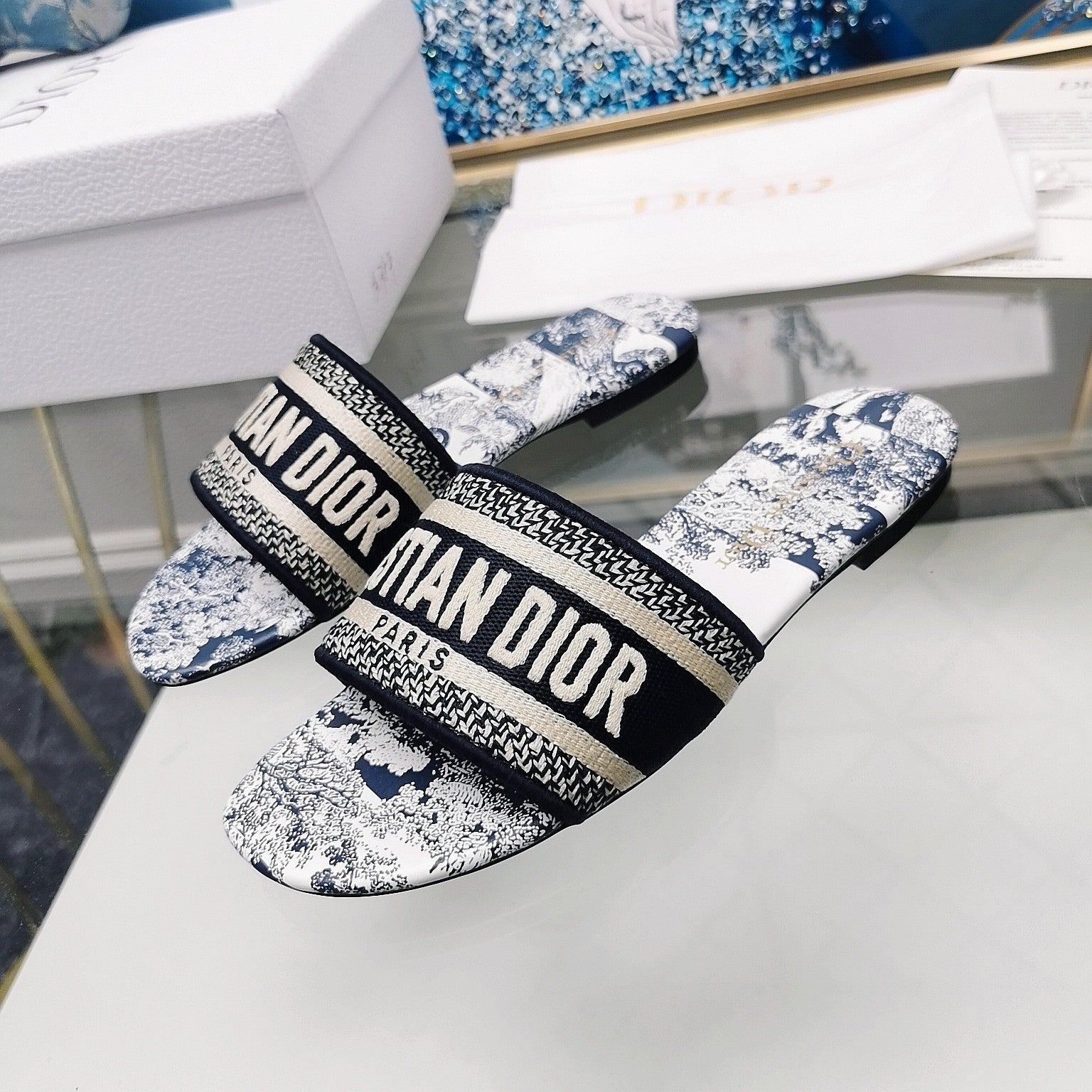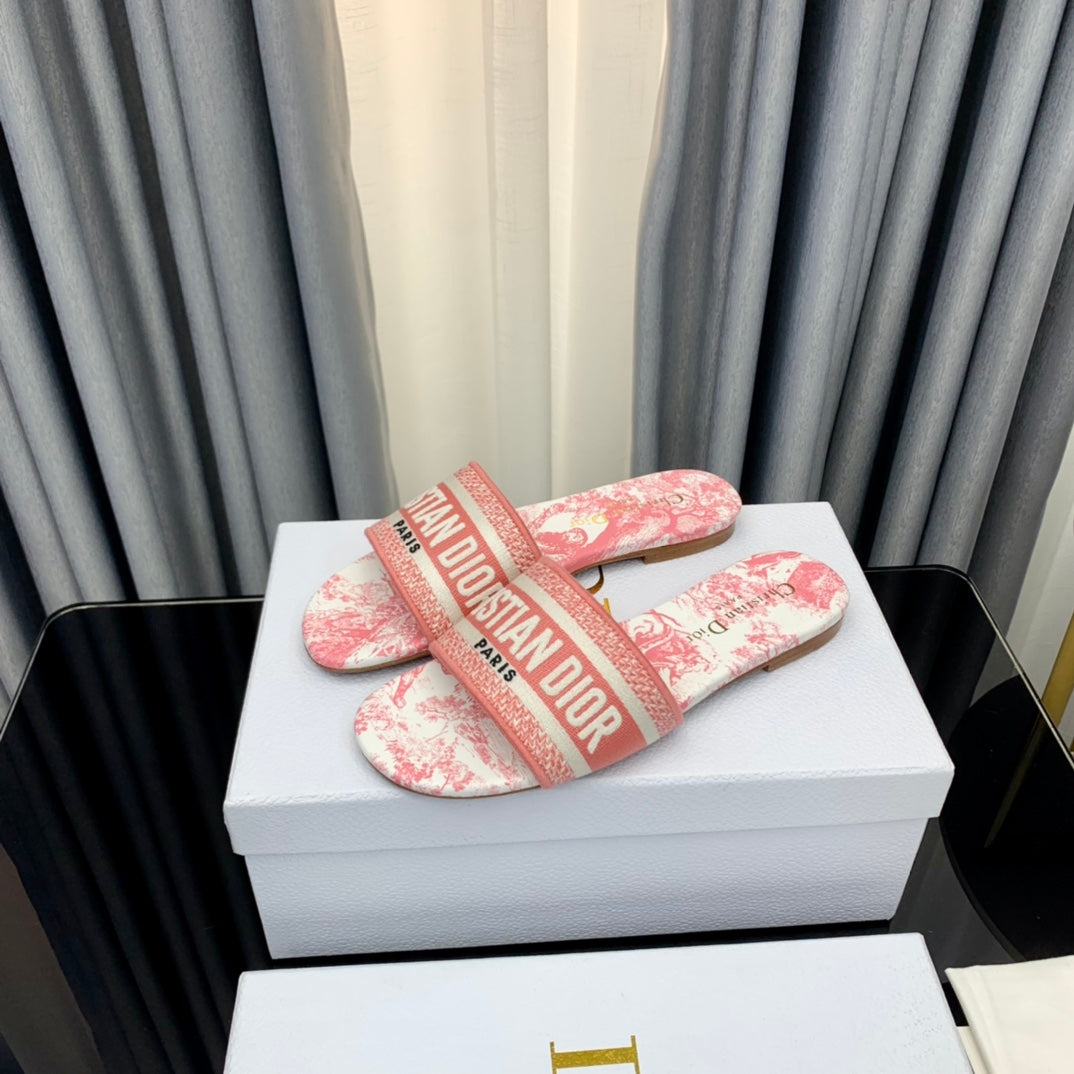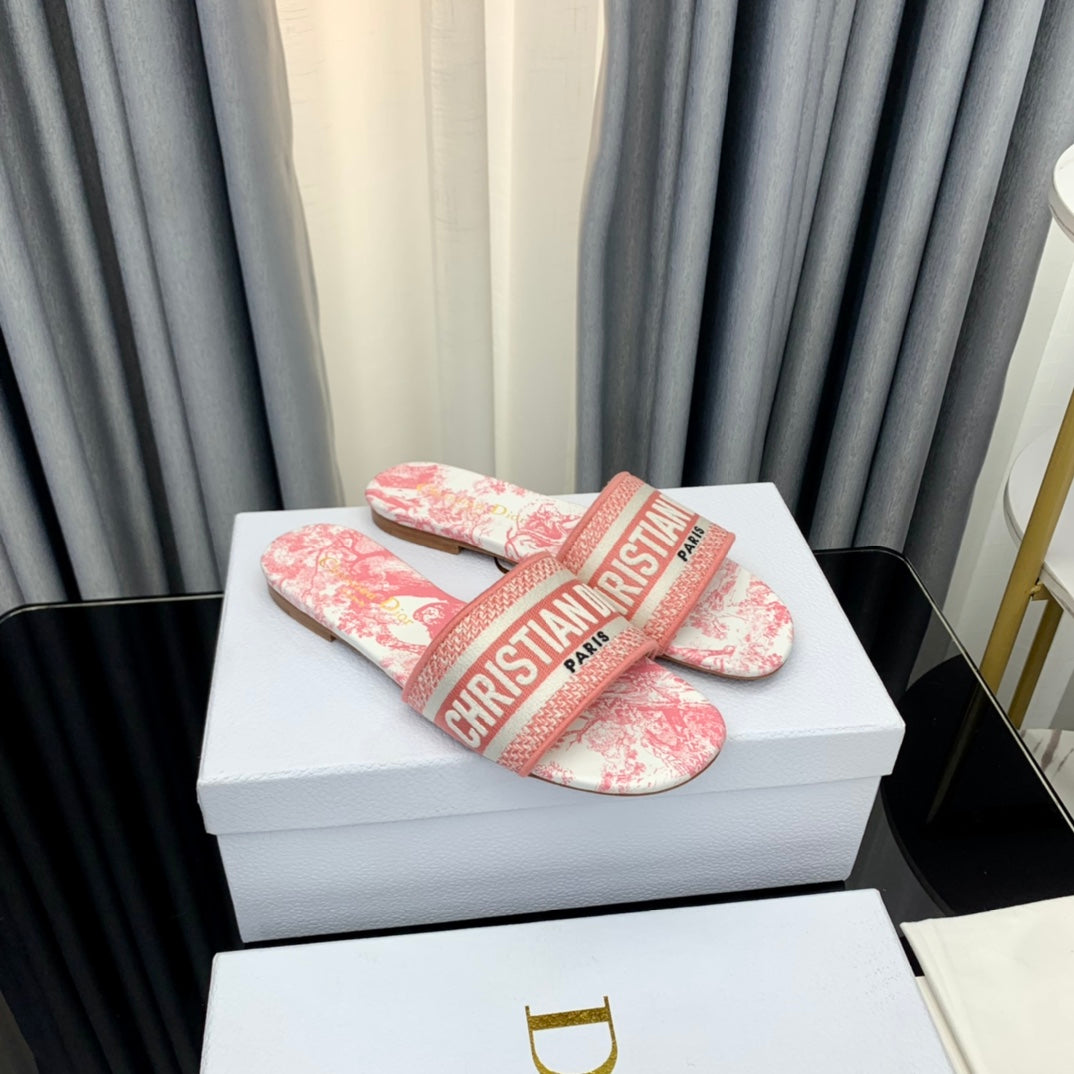 DWAY HEELED SLIDE EMBROIDERED COTTON AND NAVY BLUE MISS DIOR ALLOVER MOTIF 35 MM