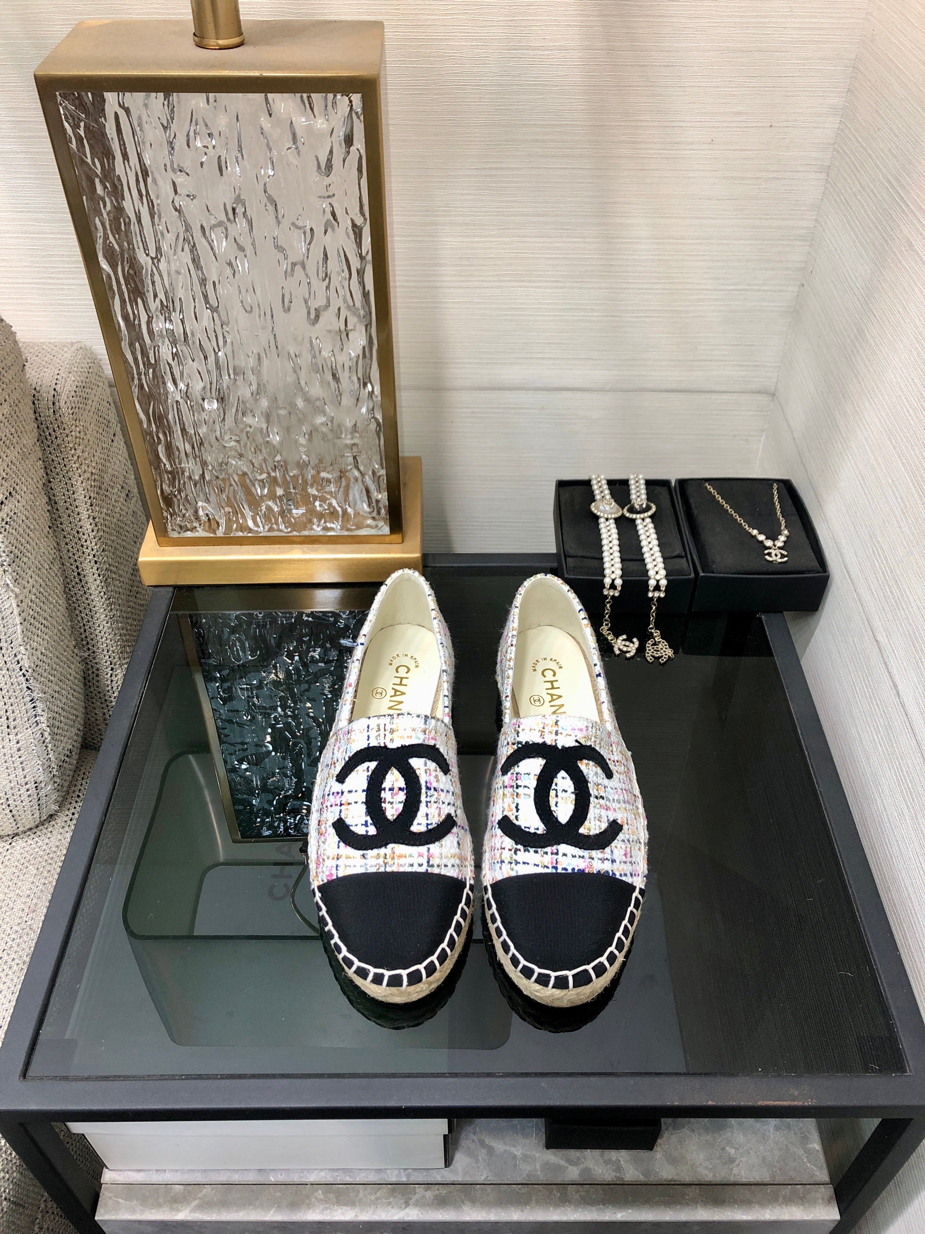 ESPADRILLE WHITE MIX BLACK TWEED FABRIC FLATS