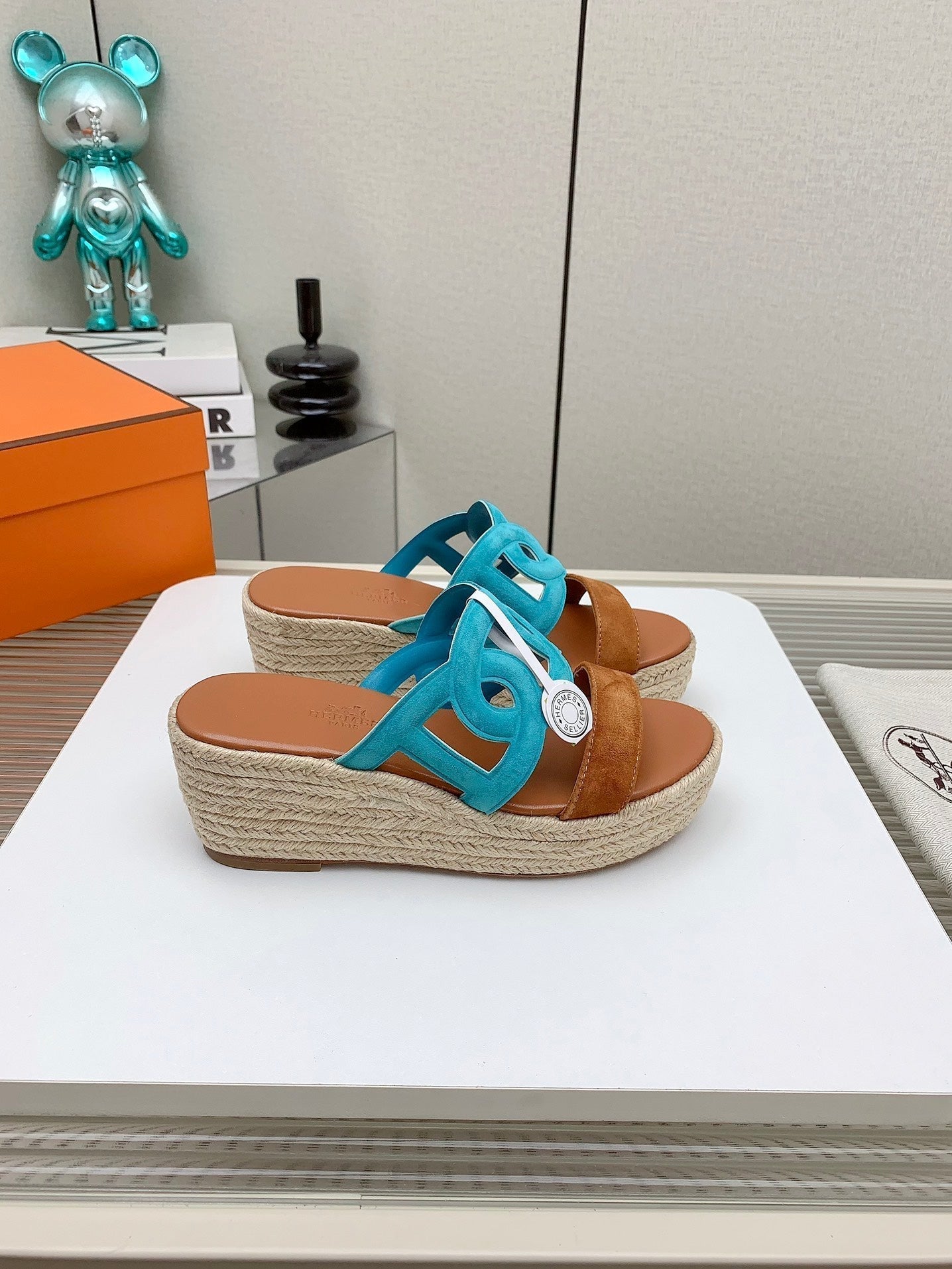 ITHEA 85 MM ESPADRILLE IN BRONZE BROWN AND CERULEAN BLUE SUEDE