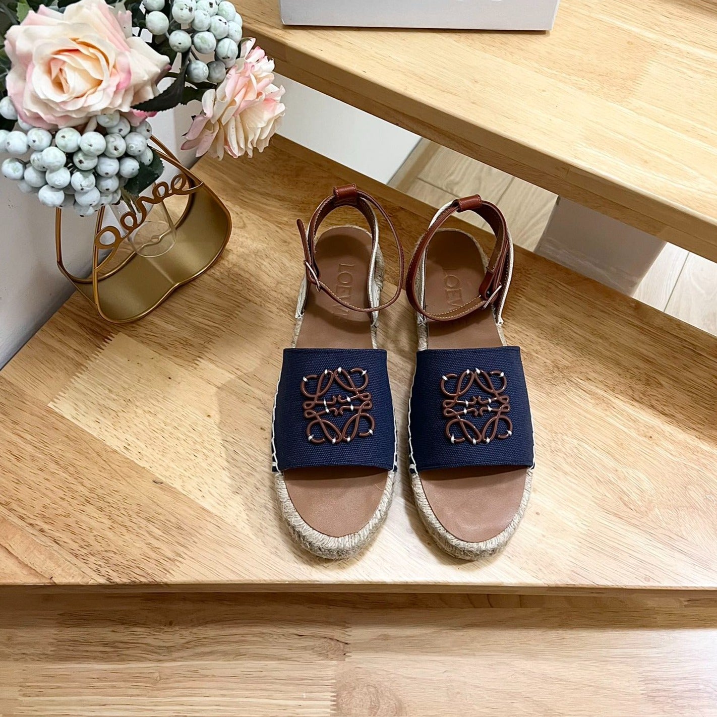 Loew Anagram Espadrille Denim Brown Leather and Canvas