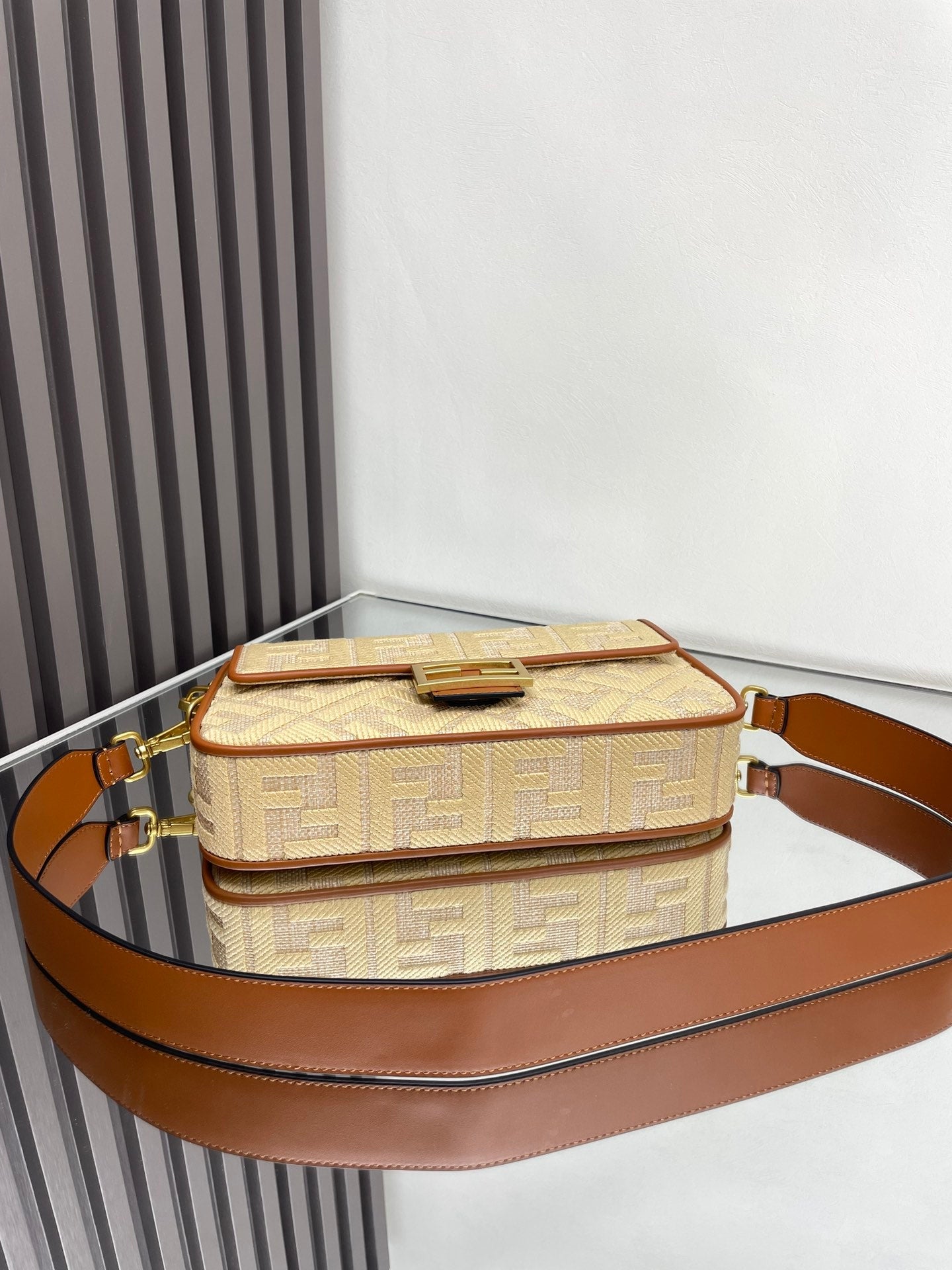 Fend Baguette Gold Tan Canvas Bag 27 with FF Embroidery Ghw