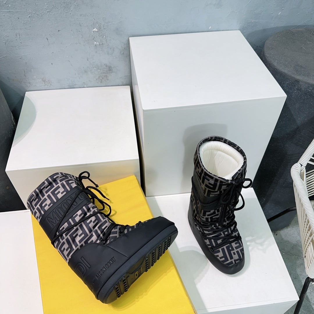 FF MOTIF MOON BOOTS IN CEDAR BROWN MONOGRAM POLYESTER AND RUBBER
