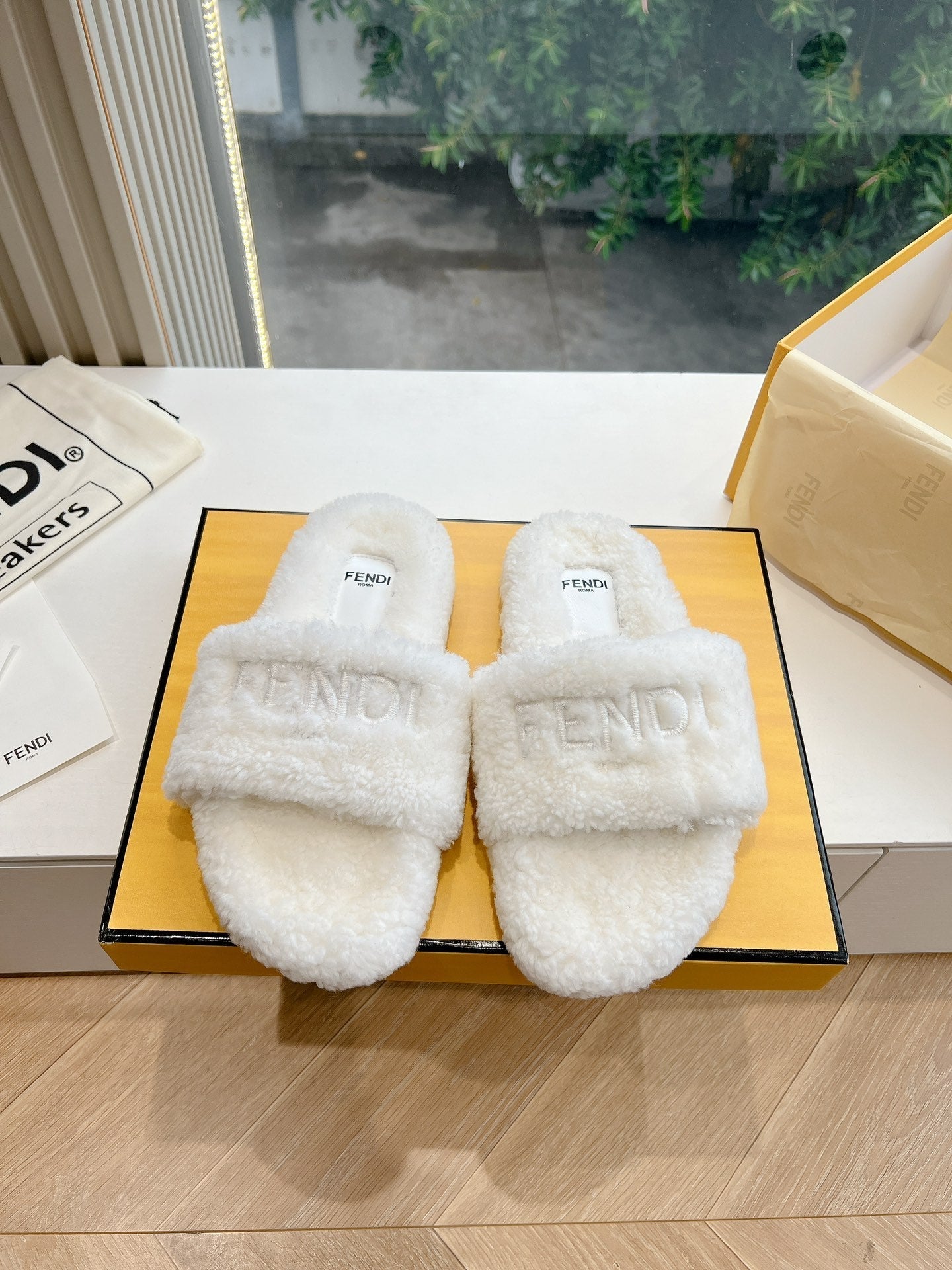 FENDI SLIPPER IN WHITE FUR WITH BROWN LOGO