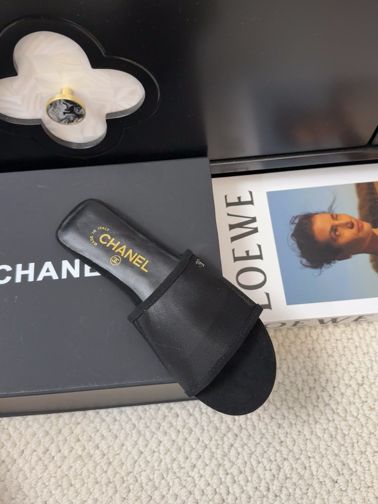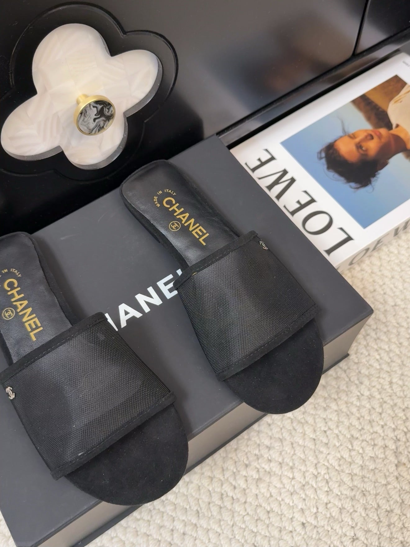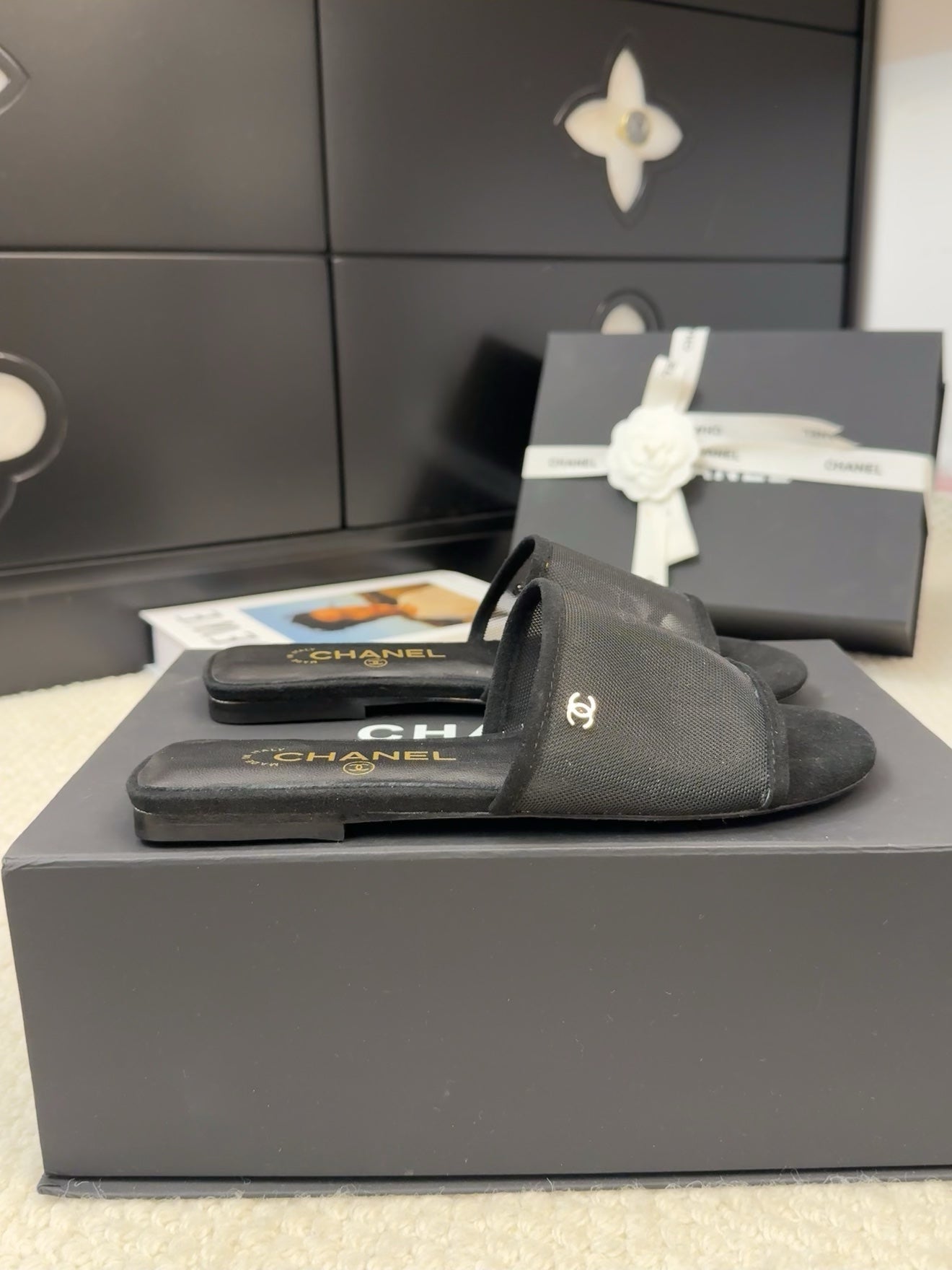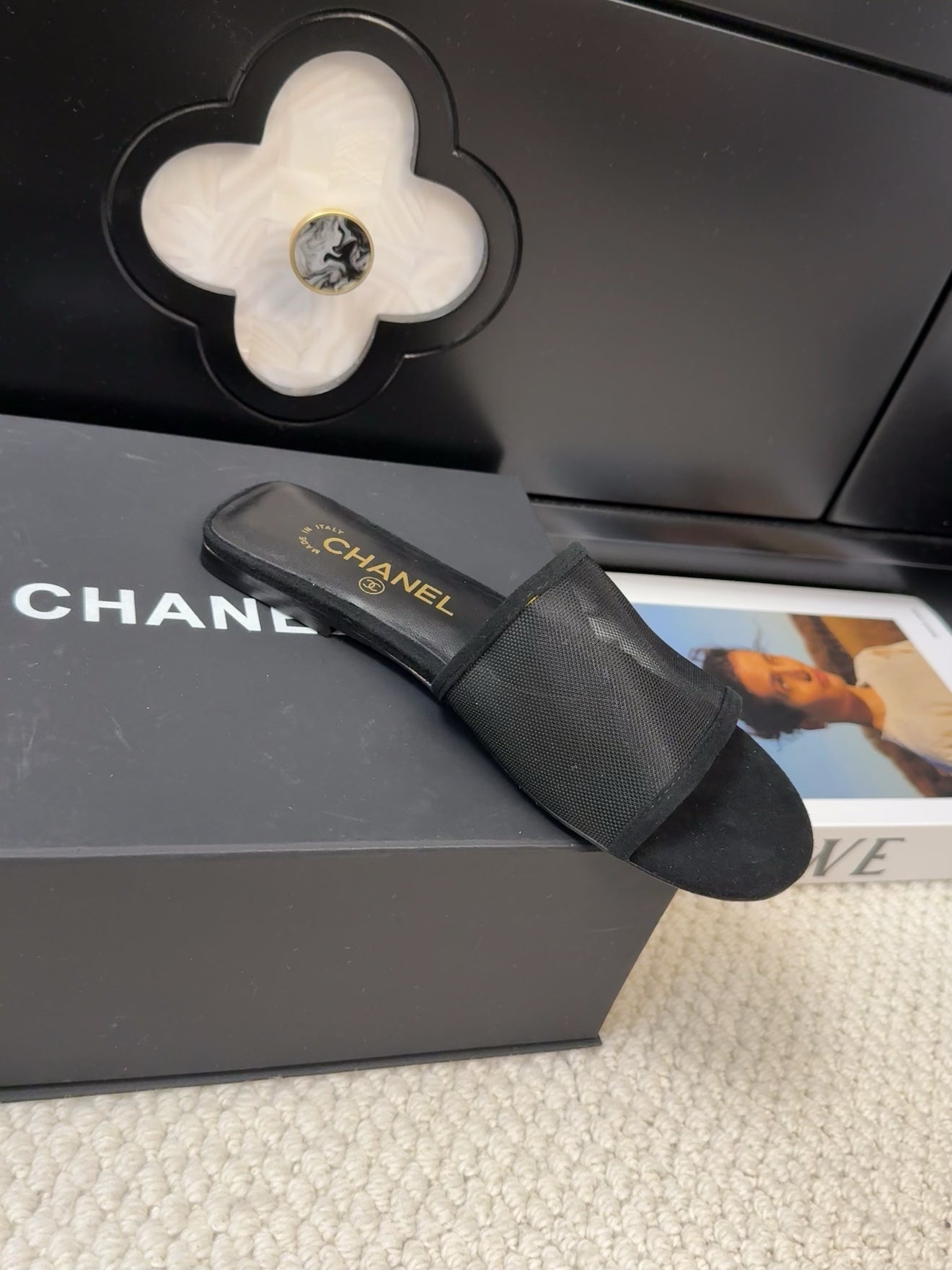 FLAT SLIDE IN BLACK MESH AND SUEDE