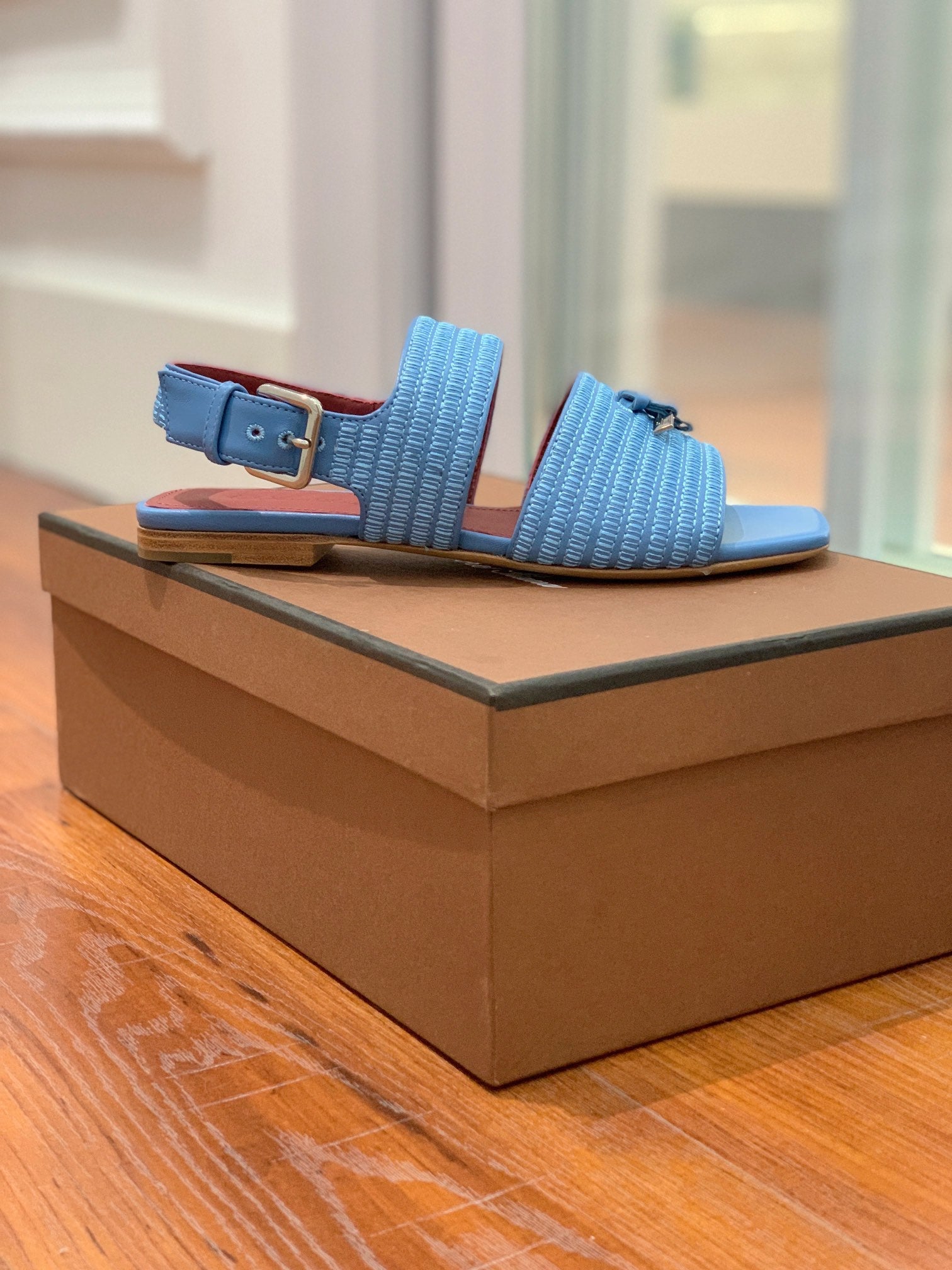 • LP RAFFIA CHARMS STRAP FLATS SANDAL SKY CALFSKIN