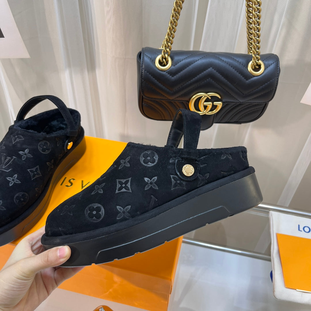 • LV WOMEN'S COSY FLAT COMFORT CLOGS IN BLACK MONOGRAM SUEDE