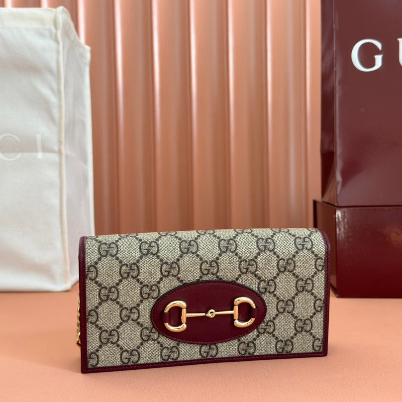 HORSEBIT 1955 WALLET ON CHAIN 19 IN BEIGE DARK BROWN NEW GG AND ROSSO ANCORA RED CALFSKIN