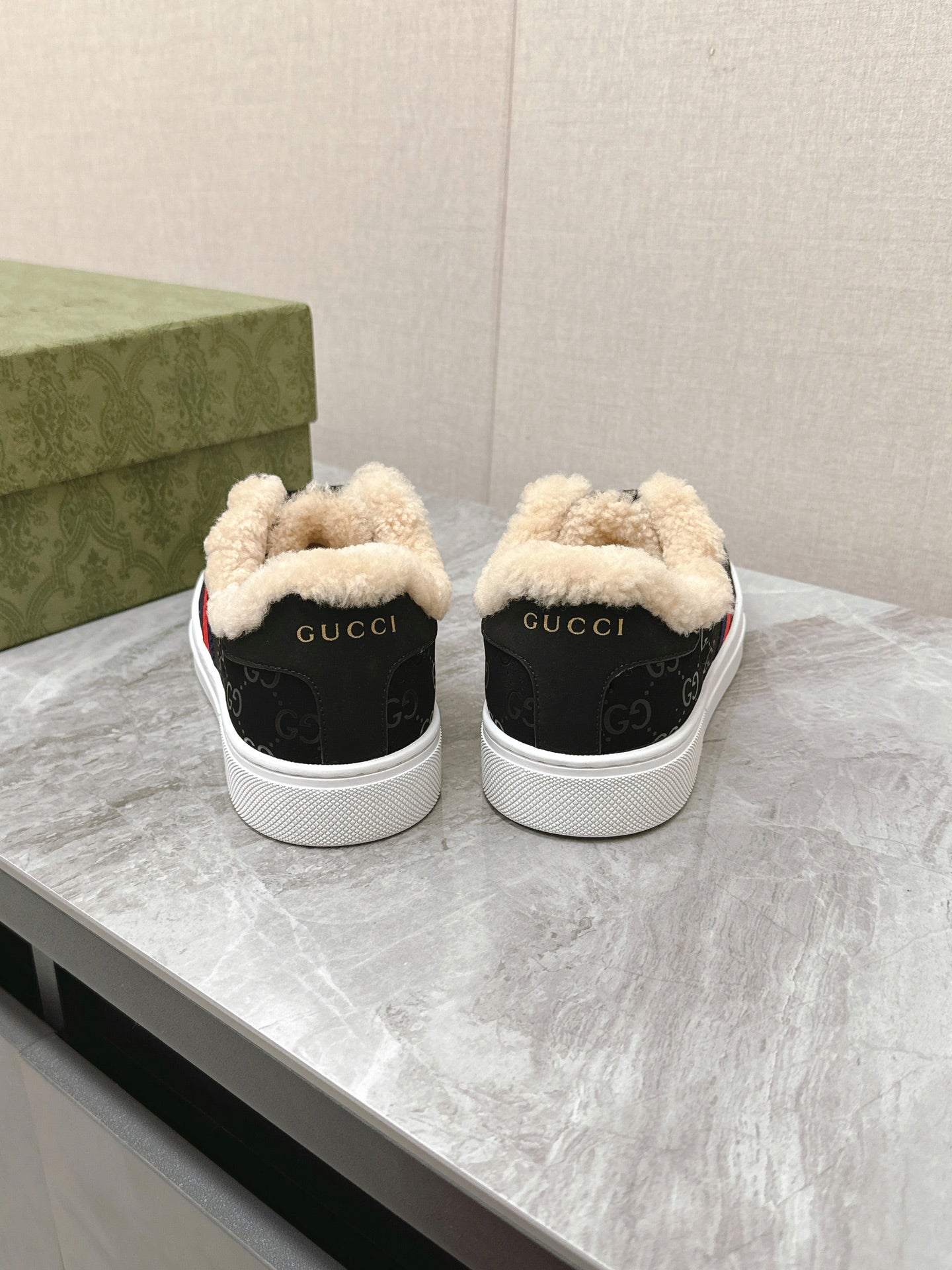 GG ACE SNEAKER WITH WEB IN BLACK EMBOSSED SUEDE AND WOOL LINING