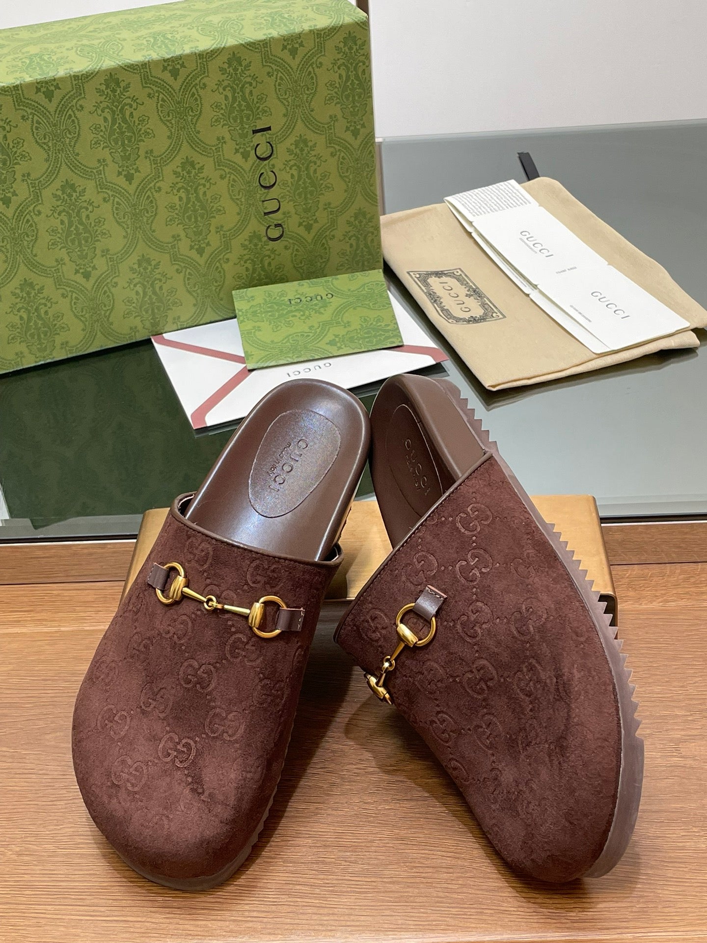GG HORSEBIT MULE IN CHOCOLATE BROWN EMBOSSED SUEDE AND SHEEPSKIN LINING
