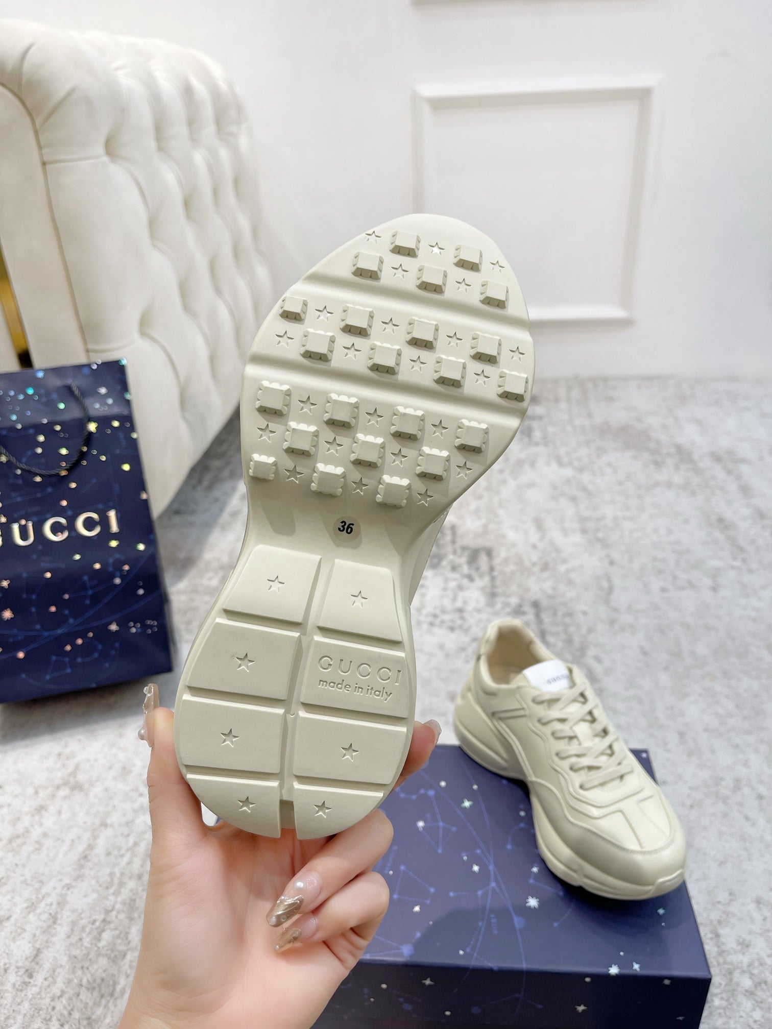 GG RHYTON TRAINER WHITE LAMBSKIN WITH FIRE MOTIF