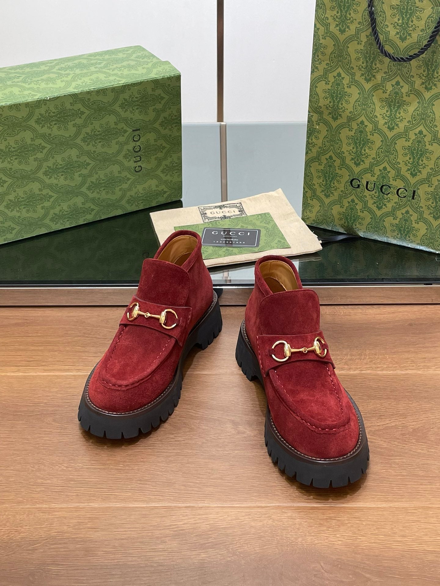 GG WOMEN'S HORSEBIT ANKLE BOOTS 4.5CM IN RED SUEDE