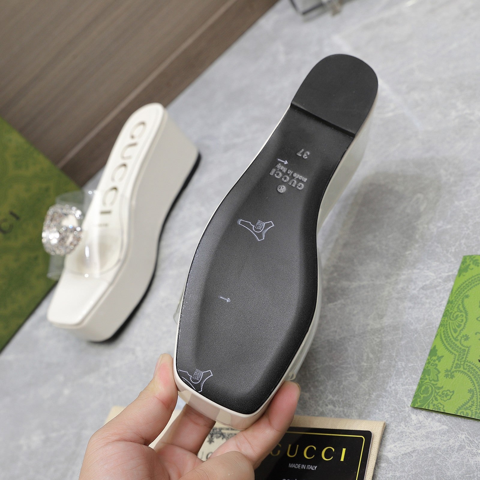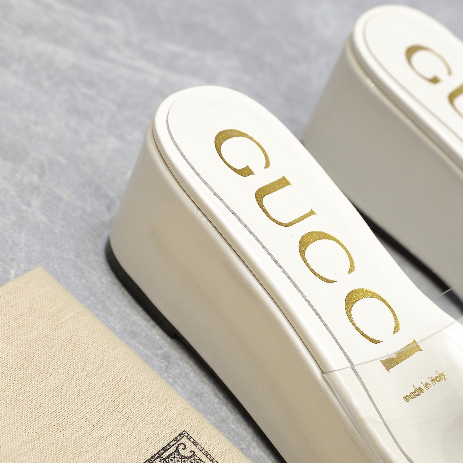 HIGH WEDGE PLATFORM IN WHITE GLOSSY CALFSKIN WITH DOUBLE CRYSTAL G BUCKLE