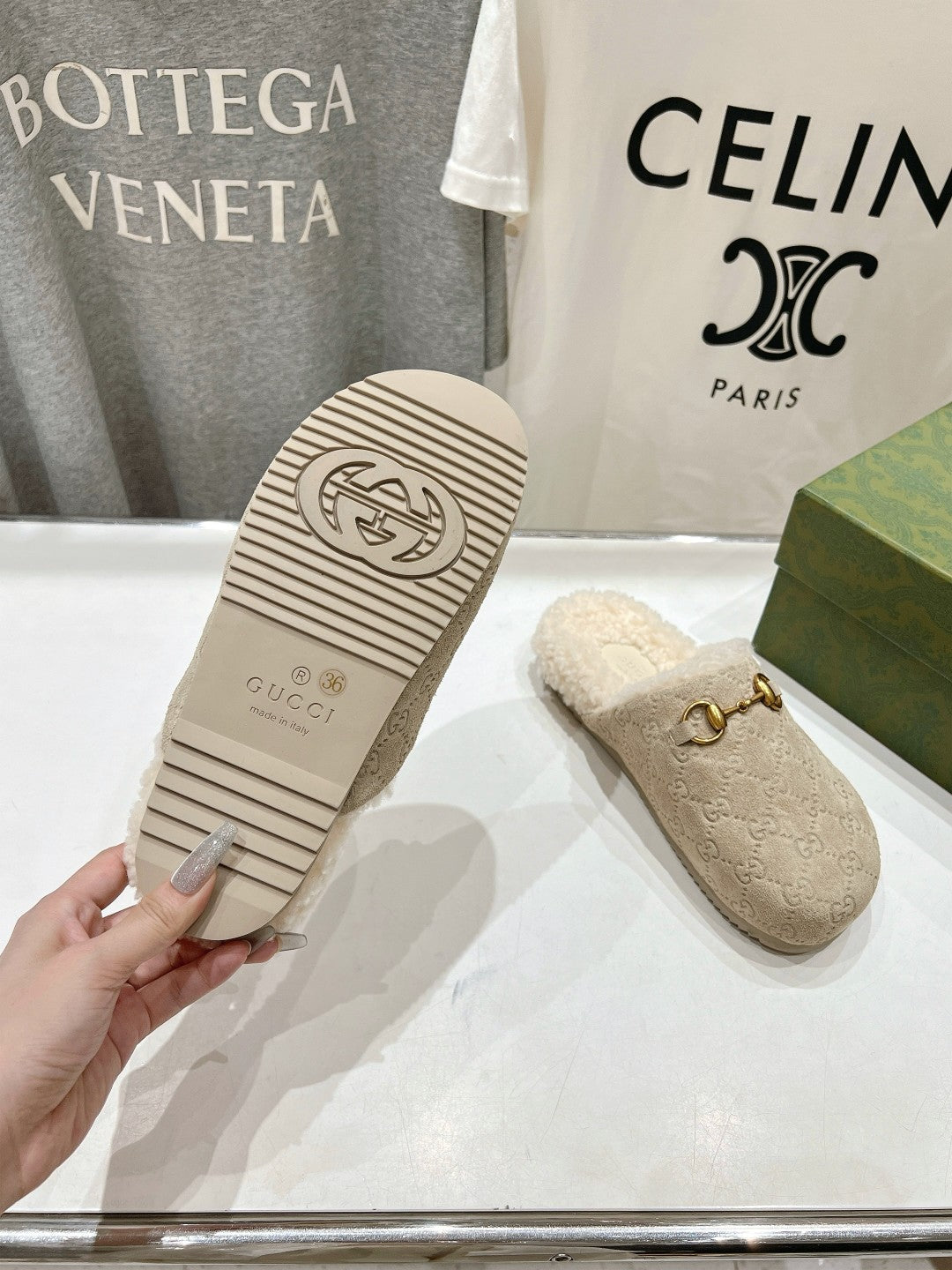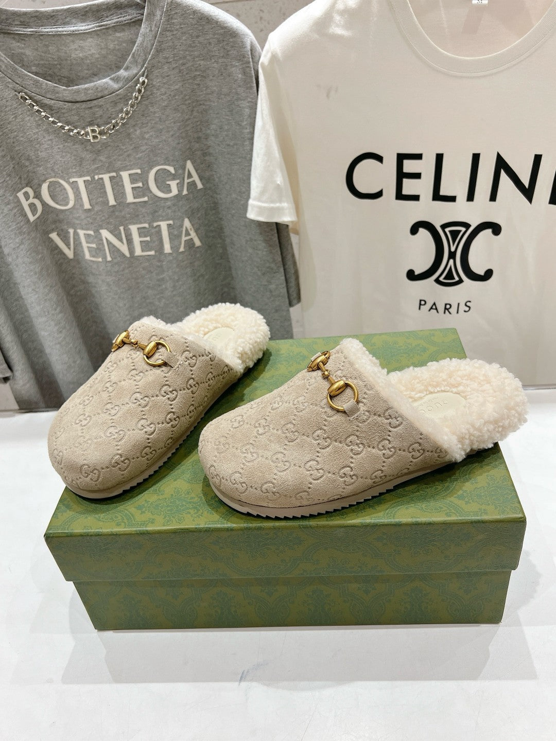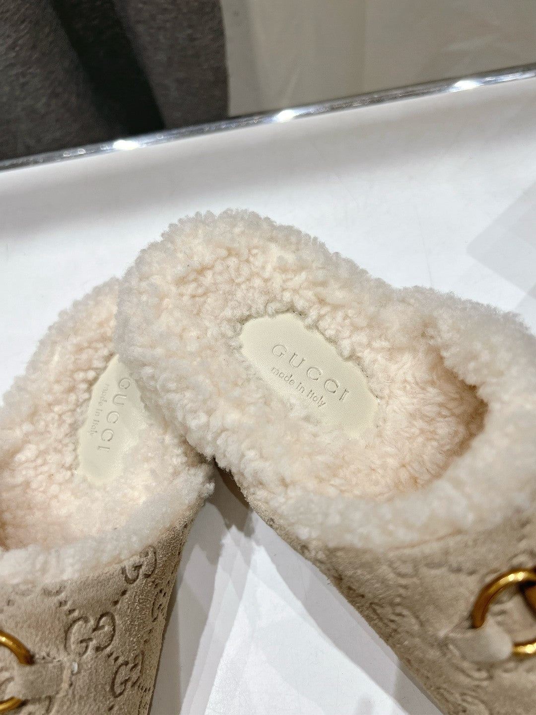 HORSEBIT MULE IN BEIGE EMBOSSED SUEDE AND FLEECE LINING