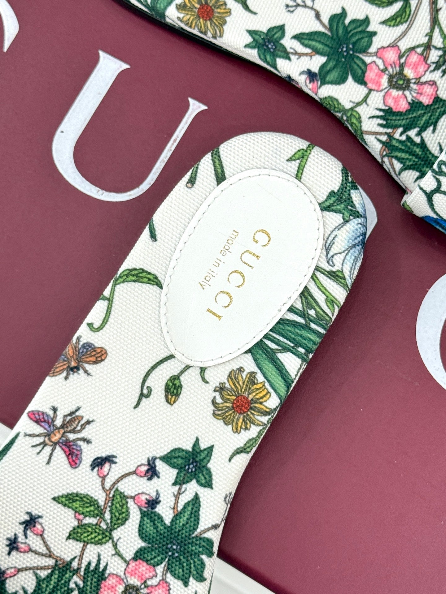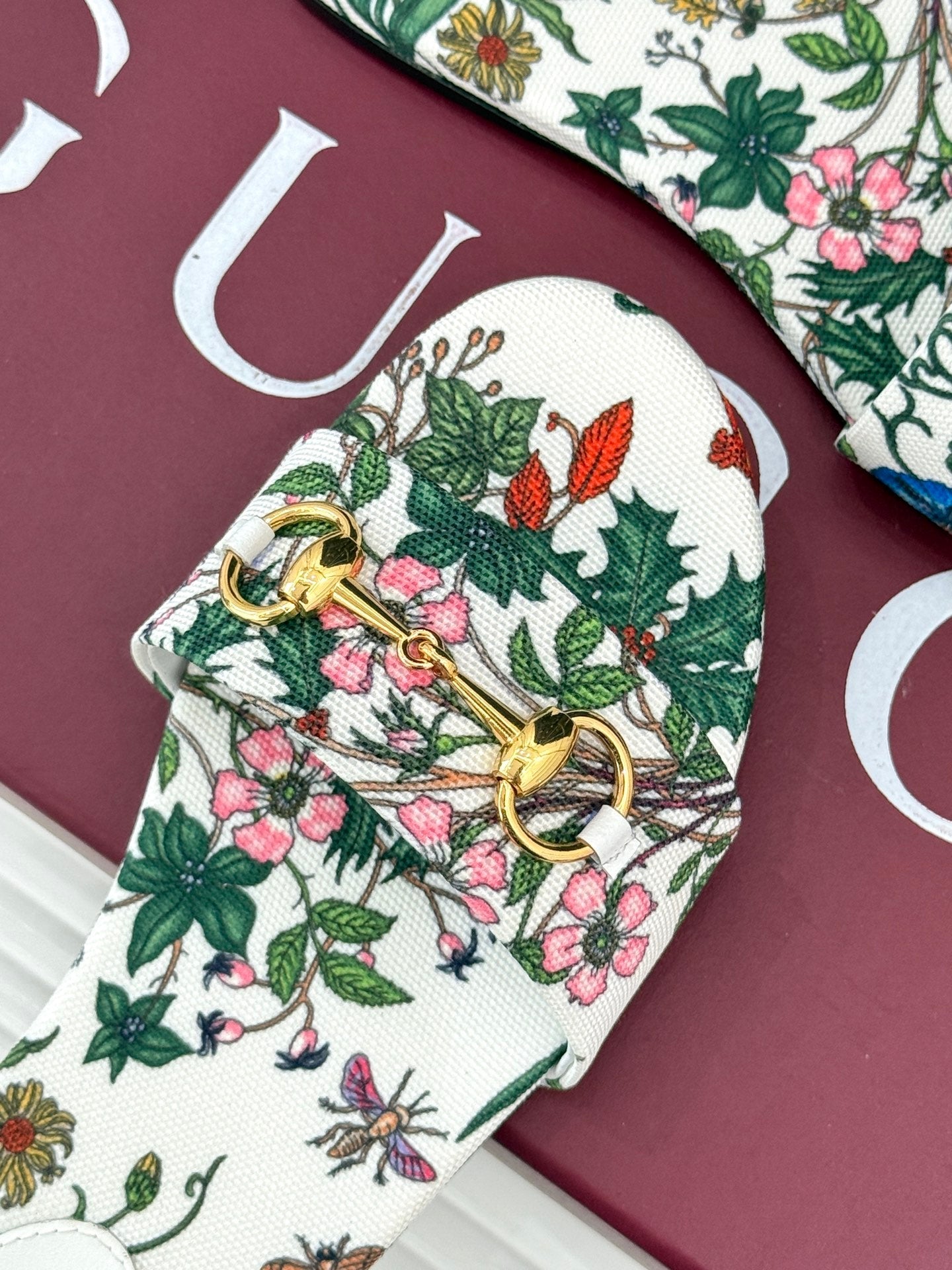 SLIDE SANDALS IN WHITE FABRIC FLORAL AND LEAF PRINT
