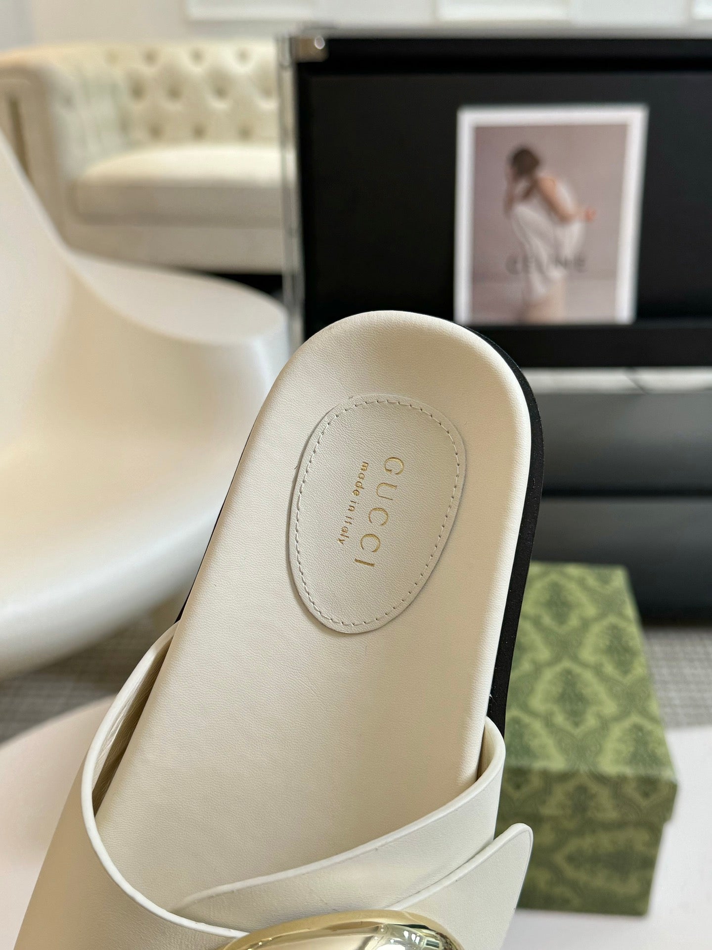 WOMEN'S SLIPPER IN WHITE CALFSKIN WITH GOLD HARDWARE