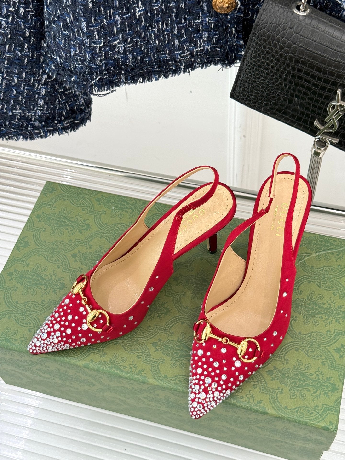 HORSEBIT SLINGBACKS IN CHERRY RED MONOGRAM FABRIC WITH CRYSTALS