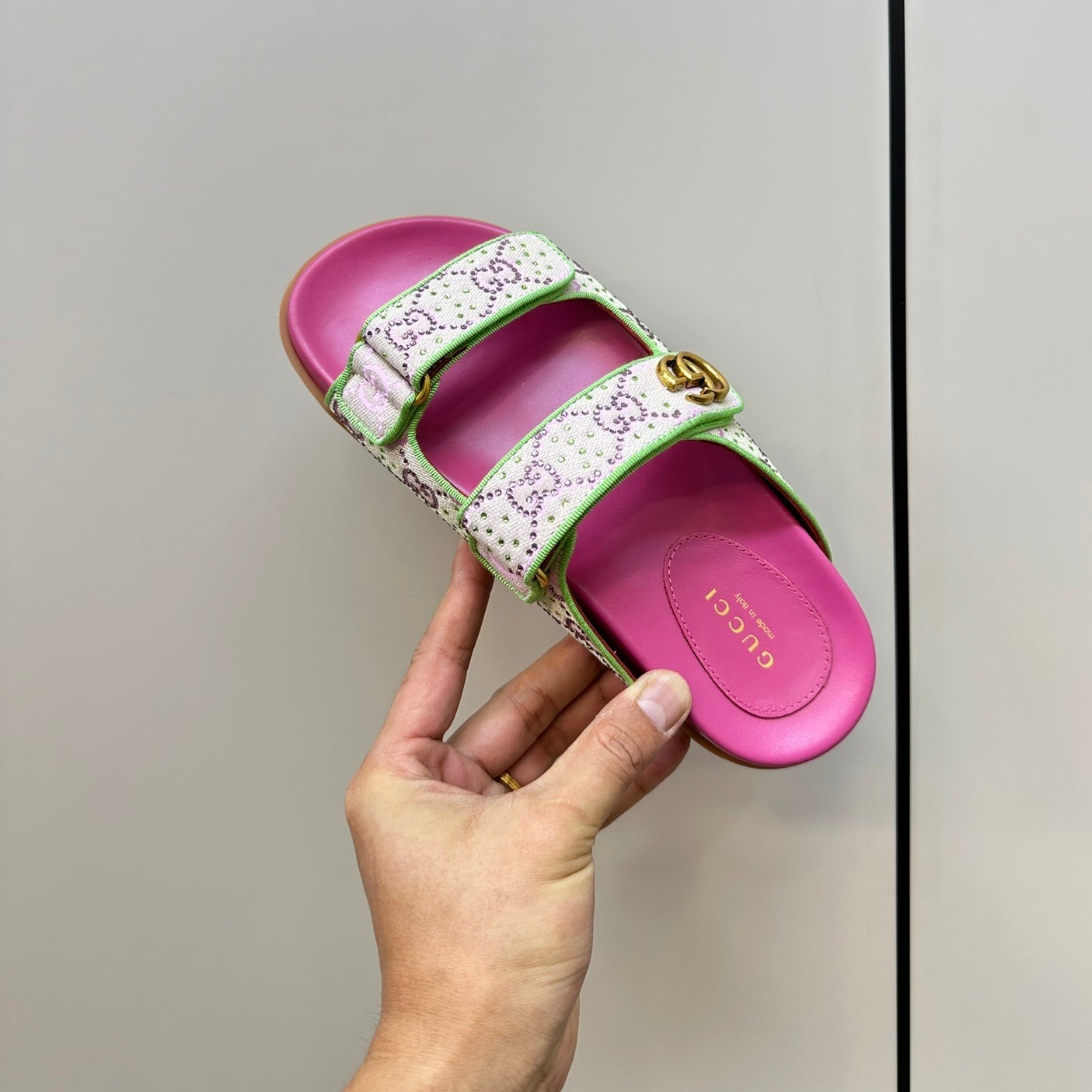 GG SPARKLE CRYSTAL SLIDE SANDAL METALLIC GOLD CALFSKIN