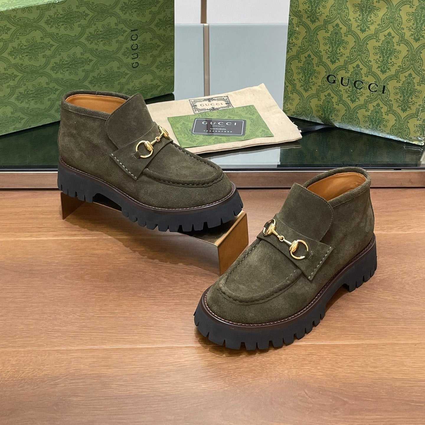 GG WOMEN'S HORSEBIT ANKLE BOOTS 4.5CM IN KHAKI GREEN SUEDE