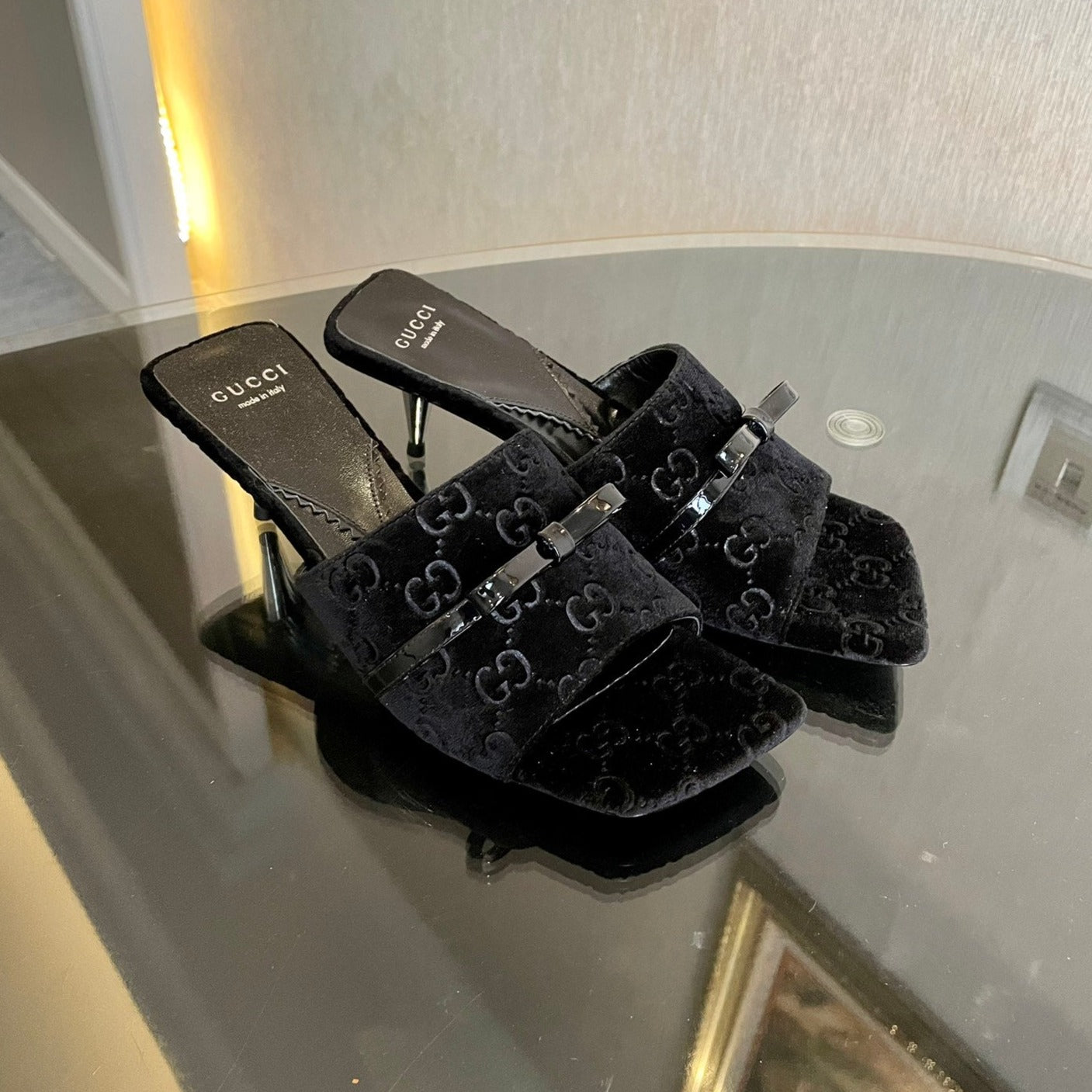 GG VELVET HIGH HEEL SANDALS WITH BEAUTIFUL LOGO DETAILS BLACK