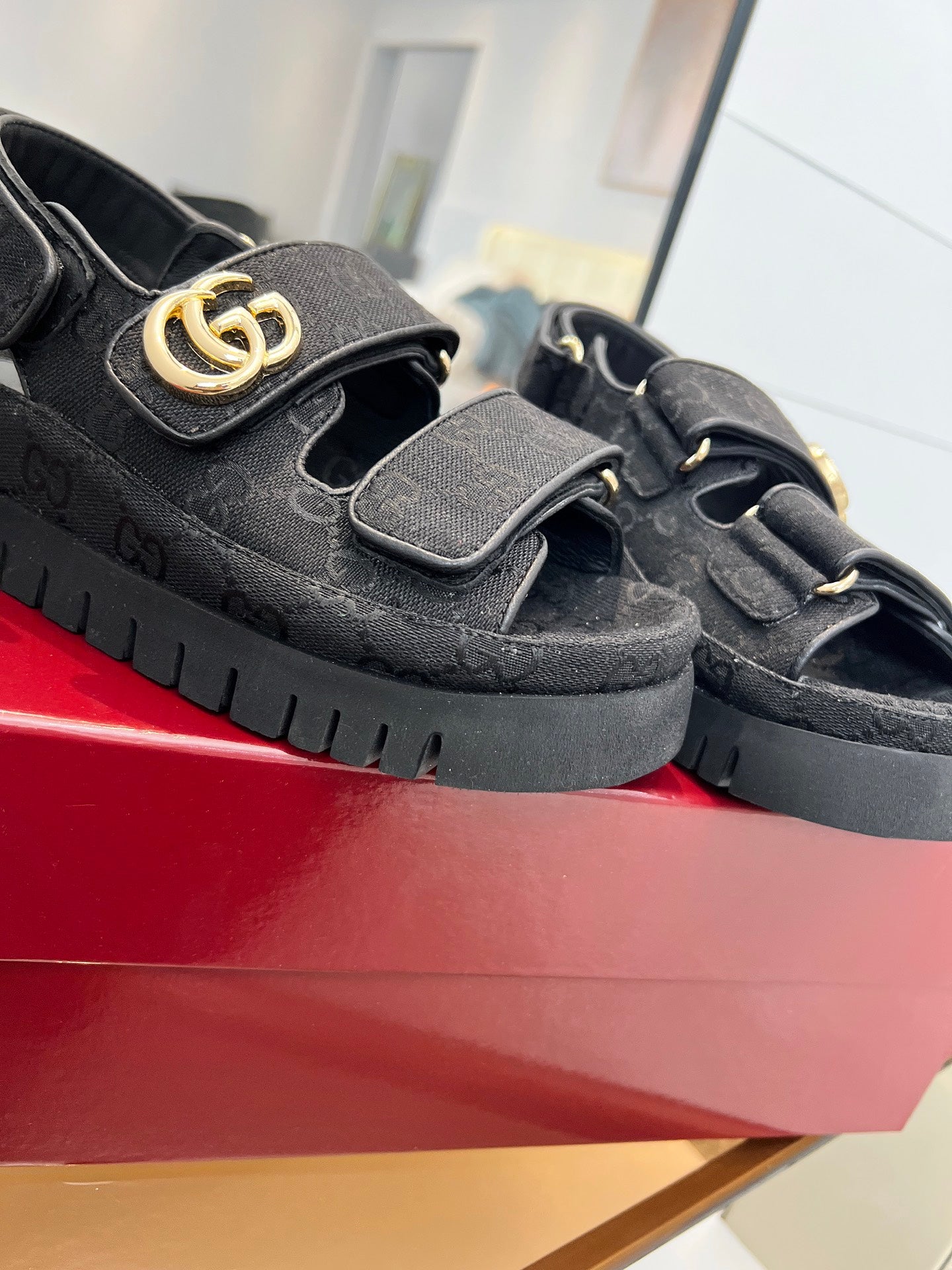 VELCRO STRAP SANDALS IN BLACK MONOGRAM CANVAS GOLD HARDWARE