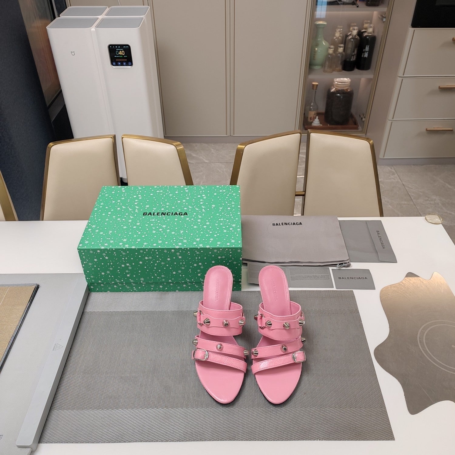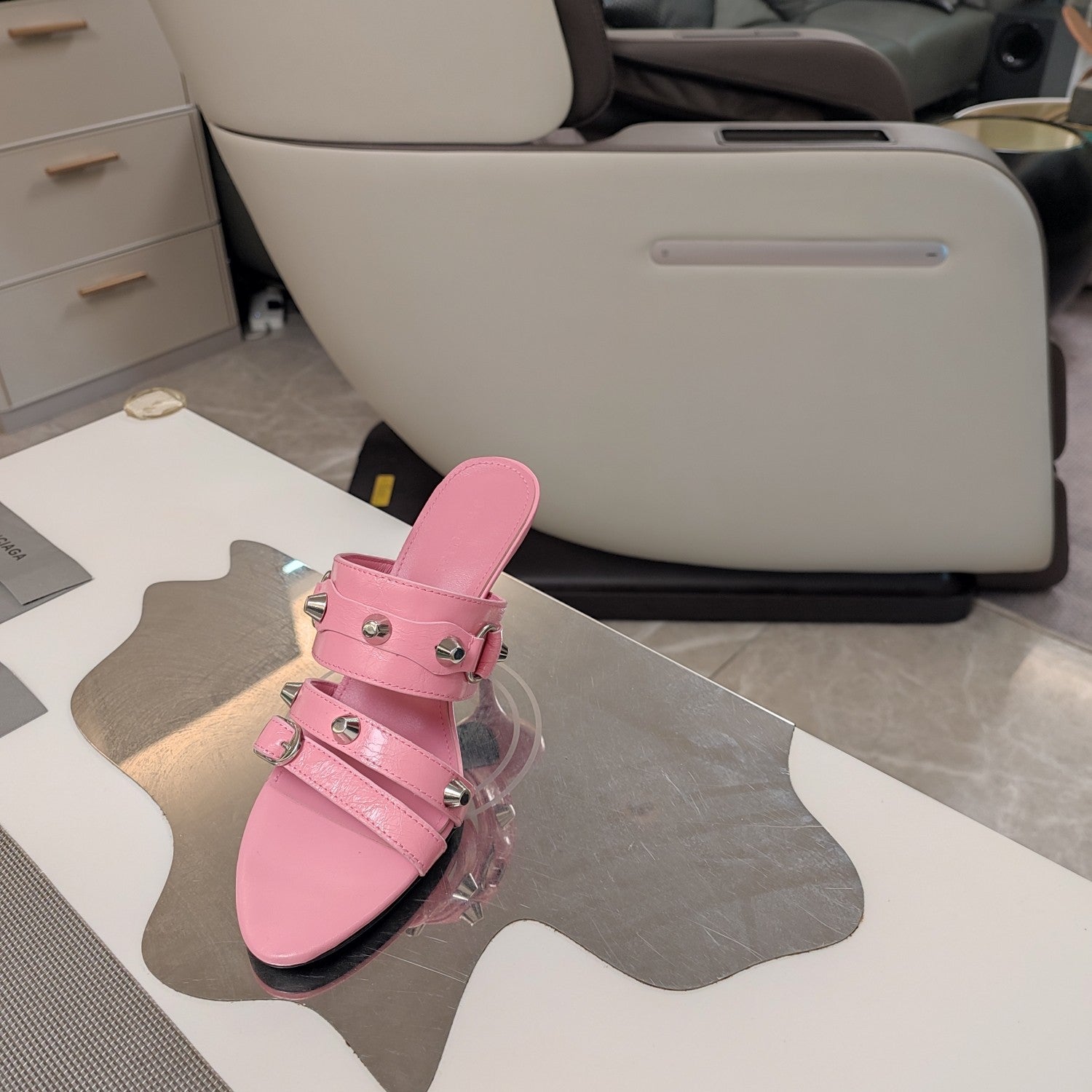 • STRAPPY HIGH-HEELED SANDALS IN WEWAK PINK STUDDED WAX-OIL SHEEPSKIN