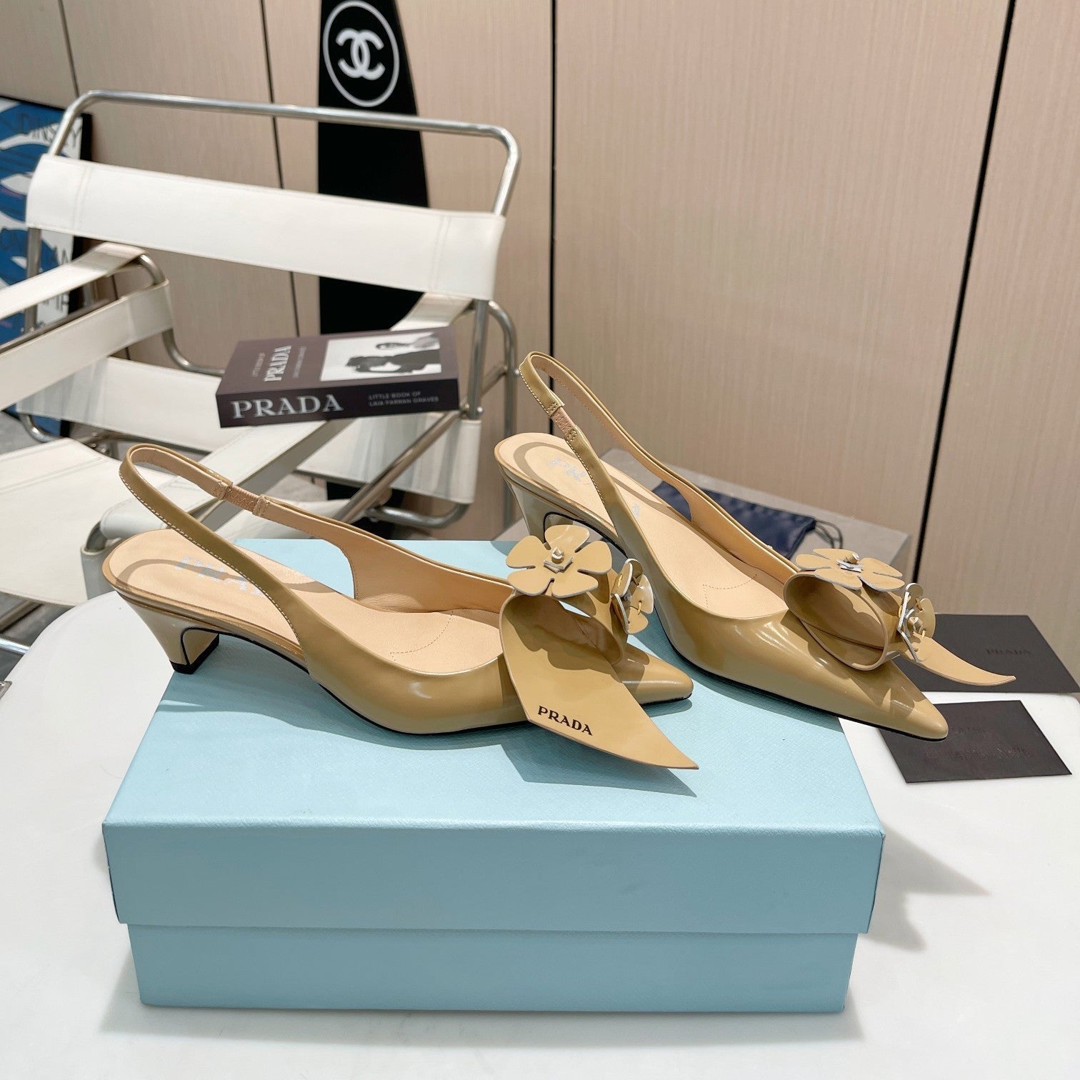 SLINGBACK KITTEN HEEL IN TORTILLA BROWN SHINY CALFSKIN ATTACHED FLOWERS