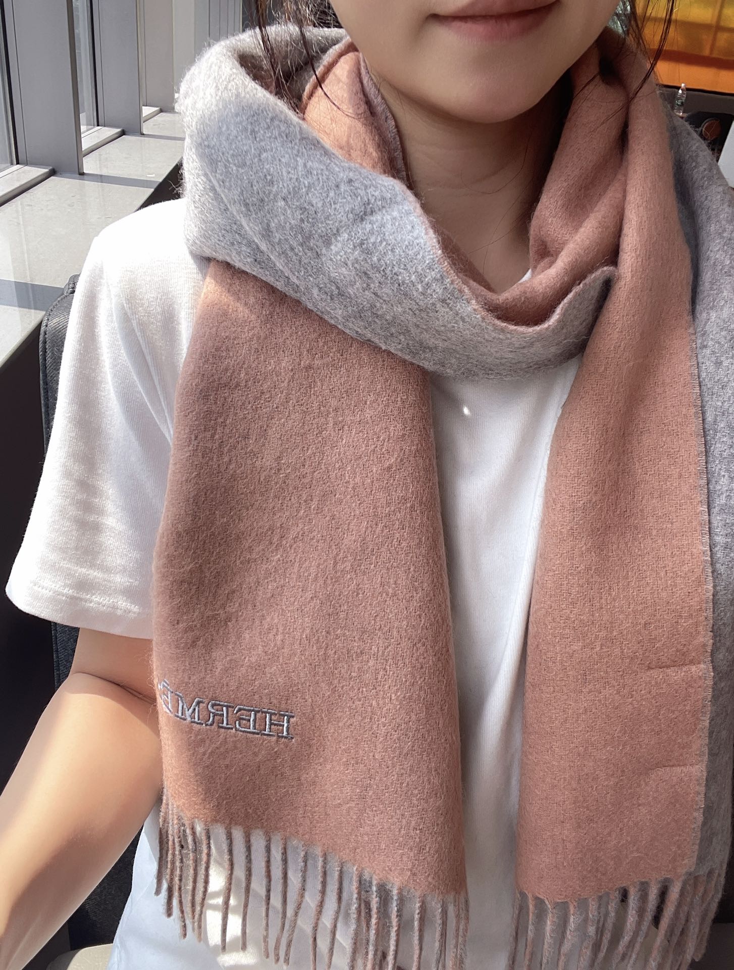 DOUBLE-FACE STOLE SCARF 180 CM IN PALE ORANGE MIX DOLPHIN GRAY CASHMERE 394460