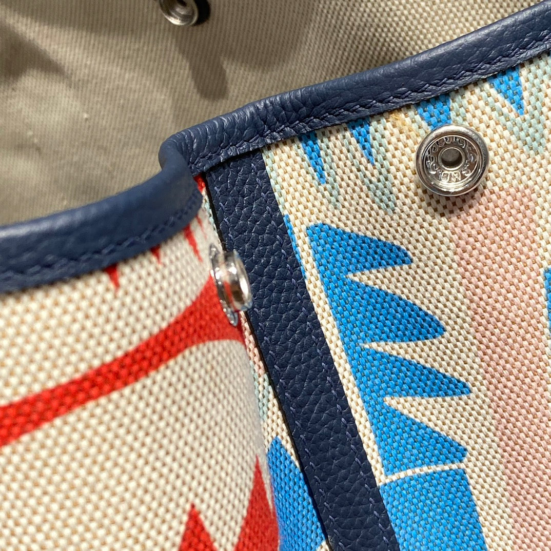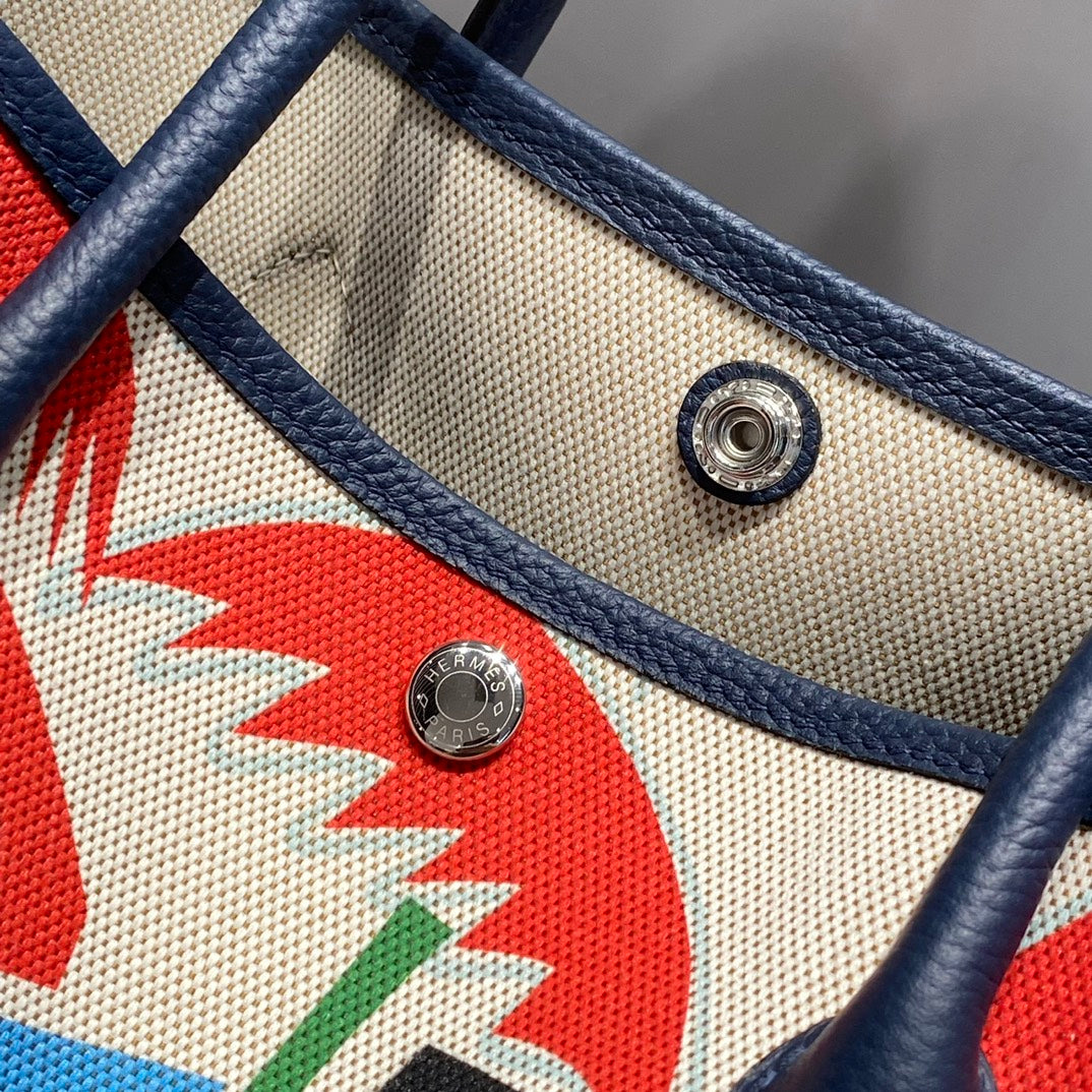GARDEN PARTY 36 IN MULTICOLOR TOILE H CANVAS BLUE NAVY CALFSKIN TROPICAL ABSTRACT LANDSCAPE PRINT