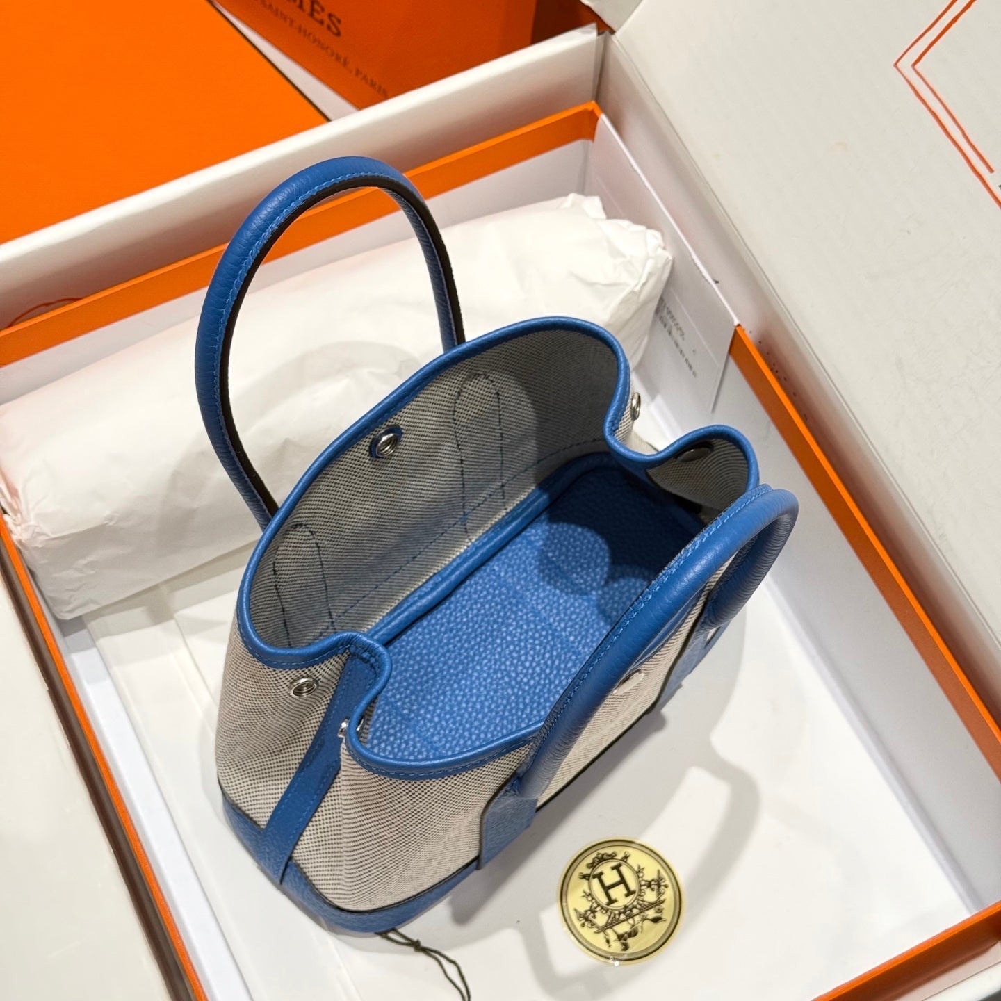 GARDEN PARTY 23CM IN WHITE MIX BLACK TOILETS COTTON CANVAS AND BLUE CALFSKIN