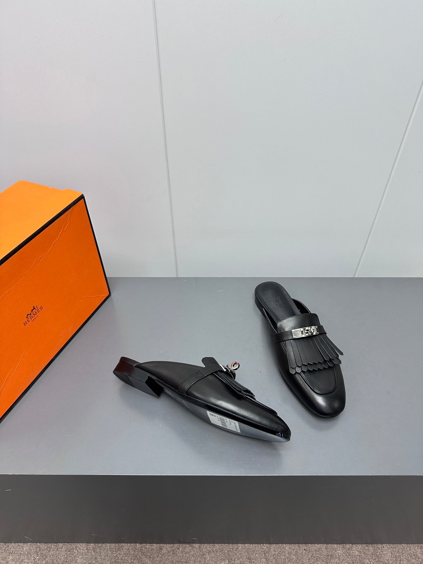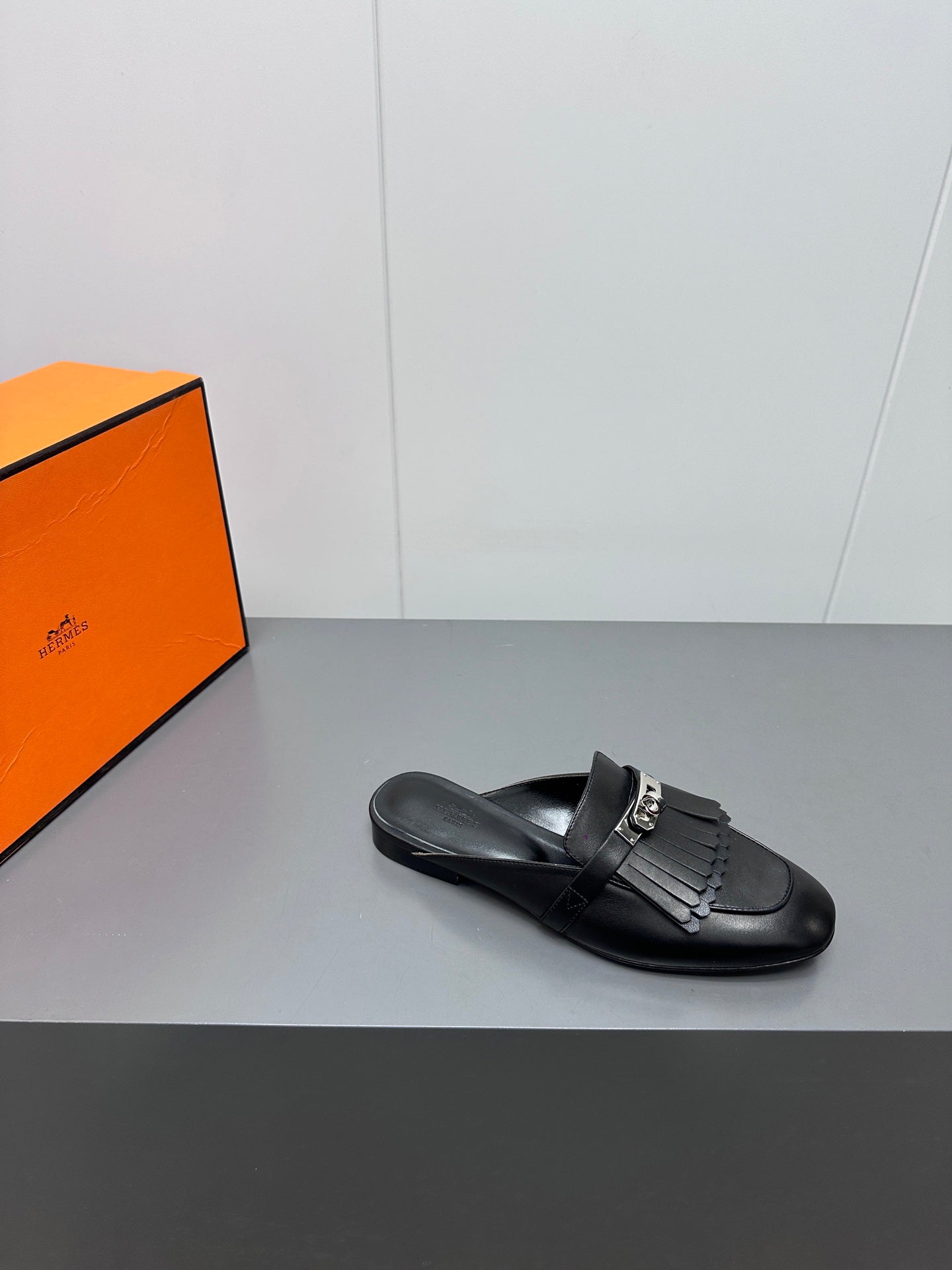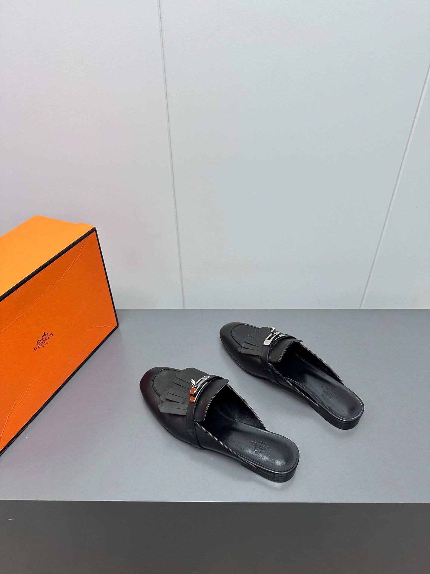 0Z MULE IN BLACK LAMBSKIN WITH FRINGE DETAIL