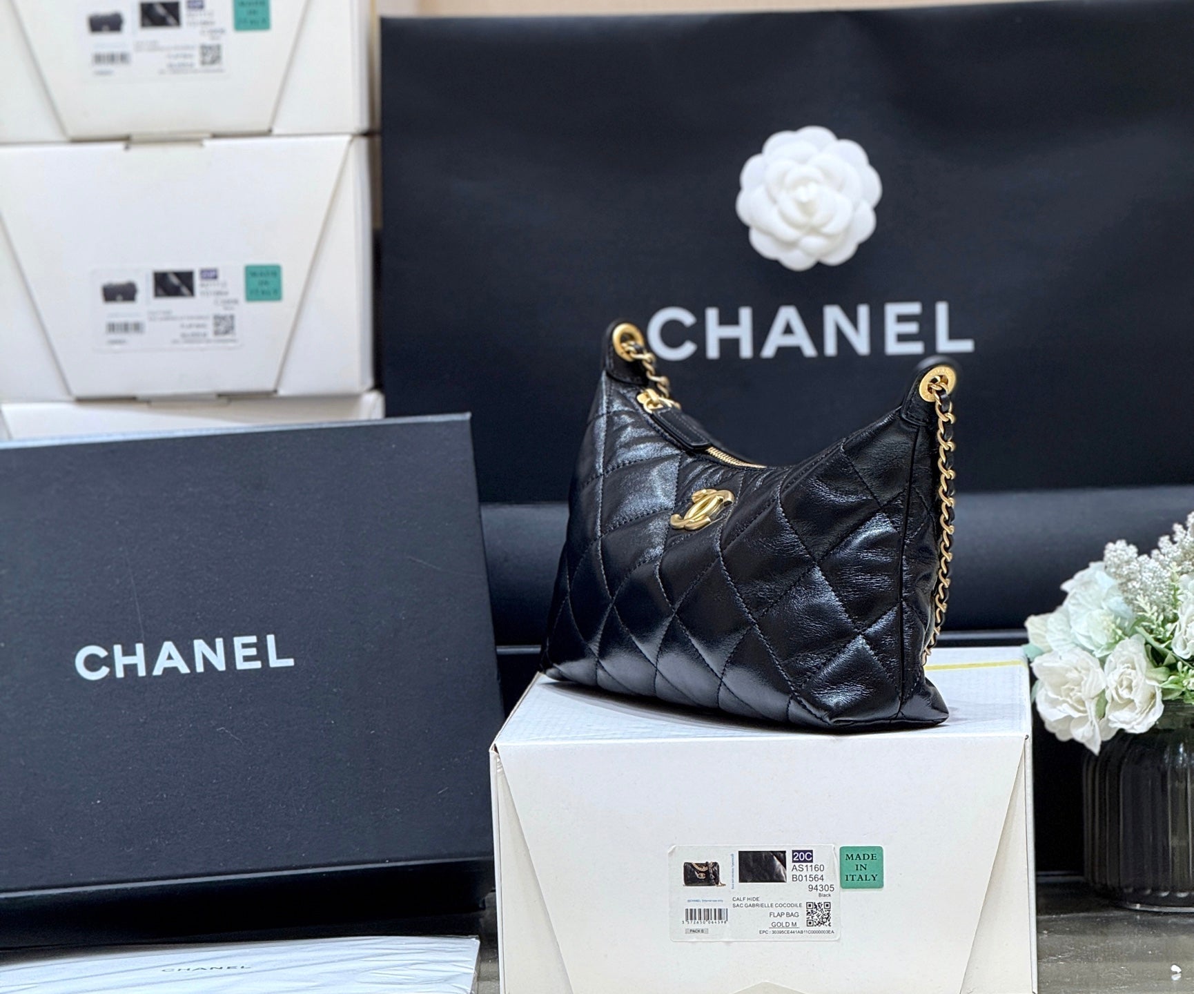 QUILTED HOBO SHOULDER BAG 26 IN BLACK GLOSSY LAMBSKIN