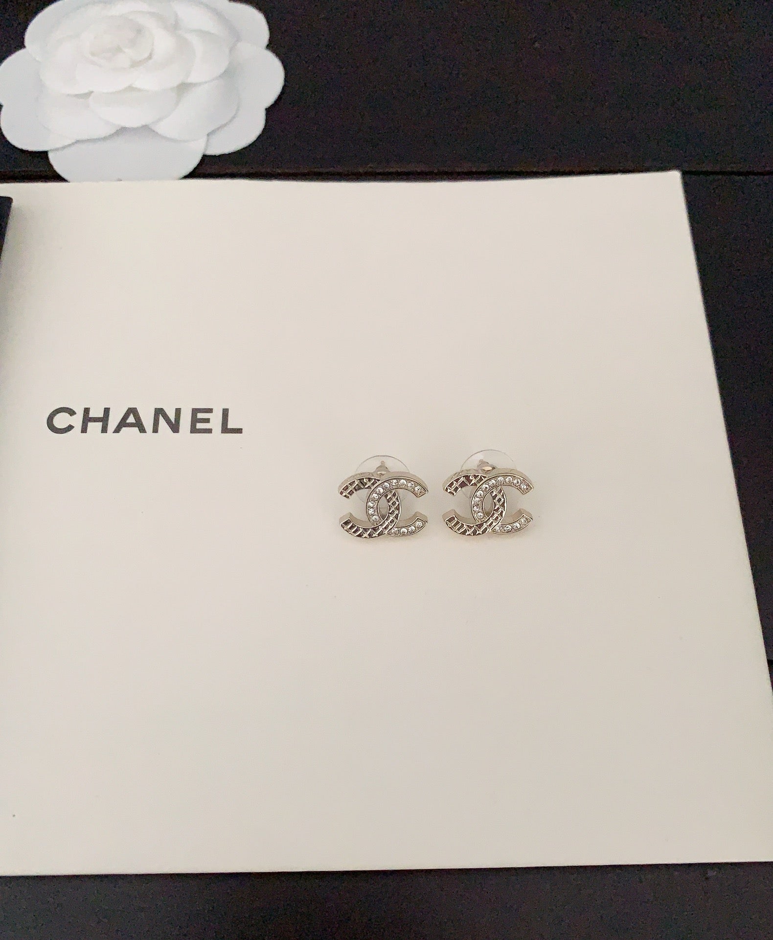 DOUBLE C STUD EARRINGS IN SILVER METAL WITH BLACK OUTLINE AND CRYSTALS INSIDE