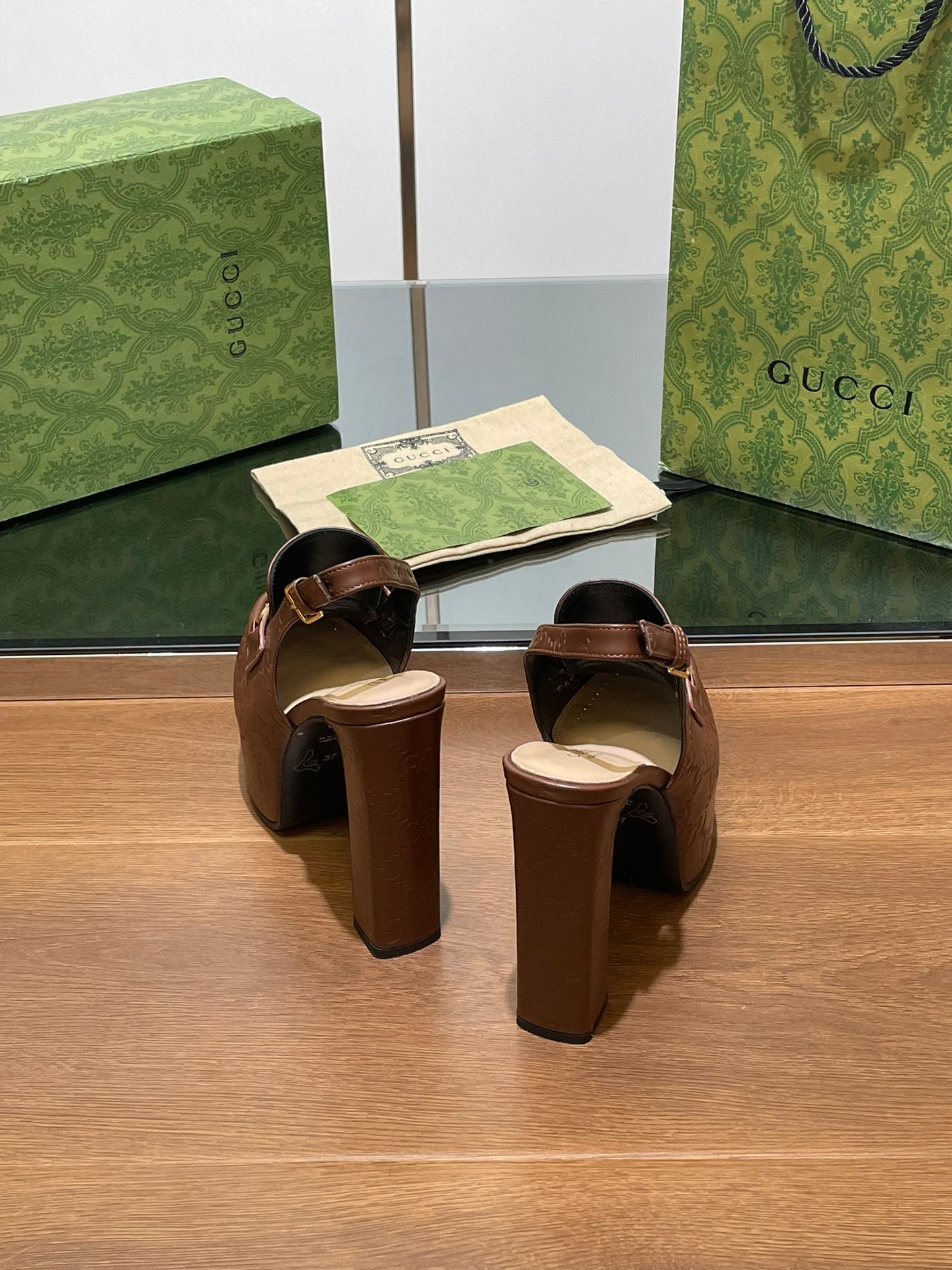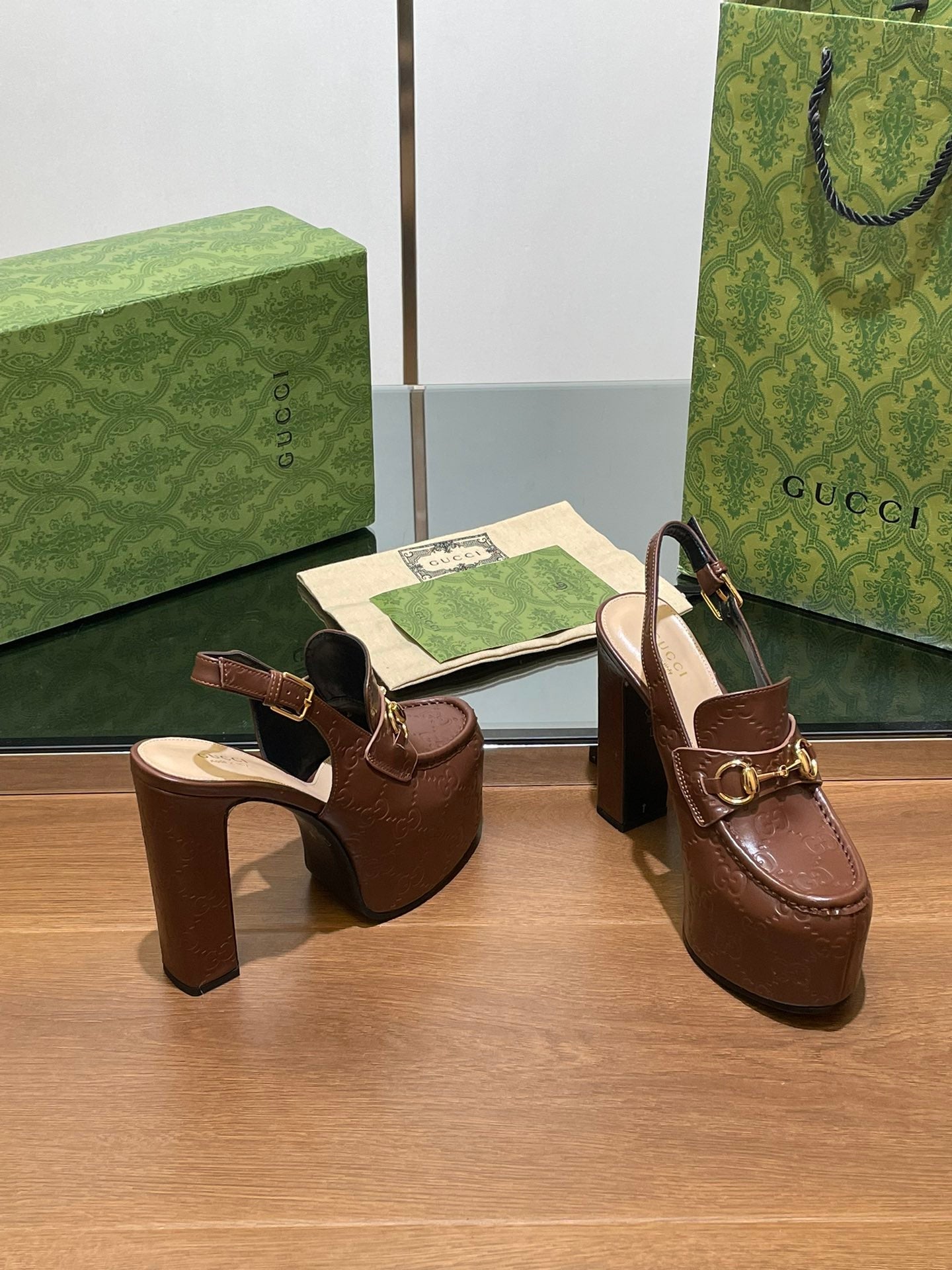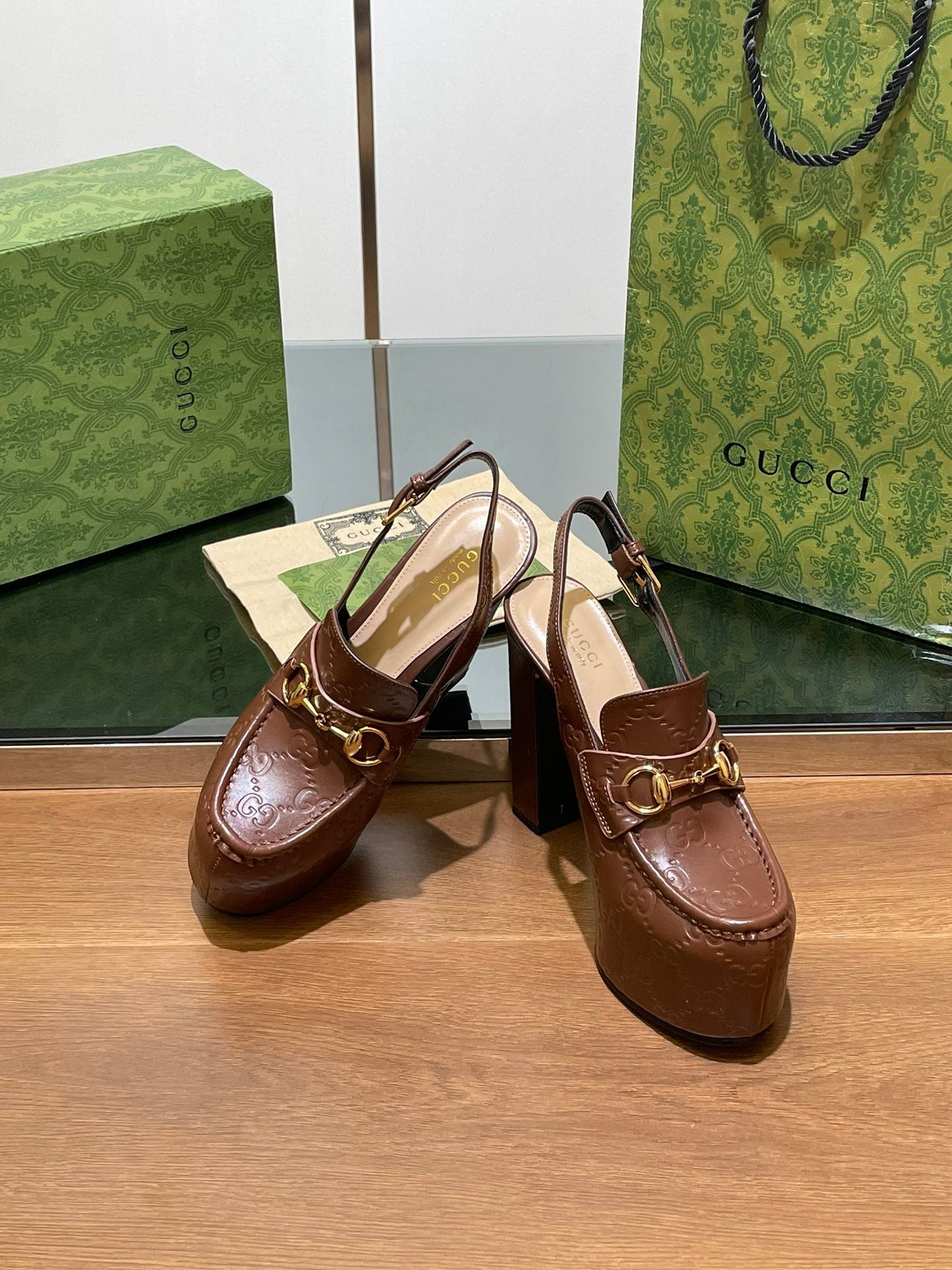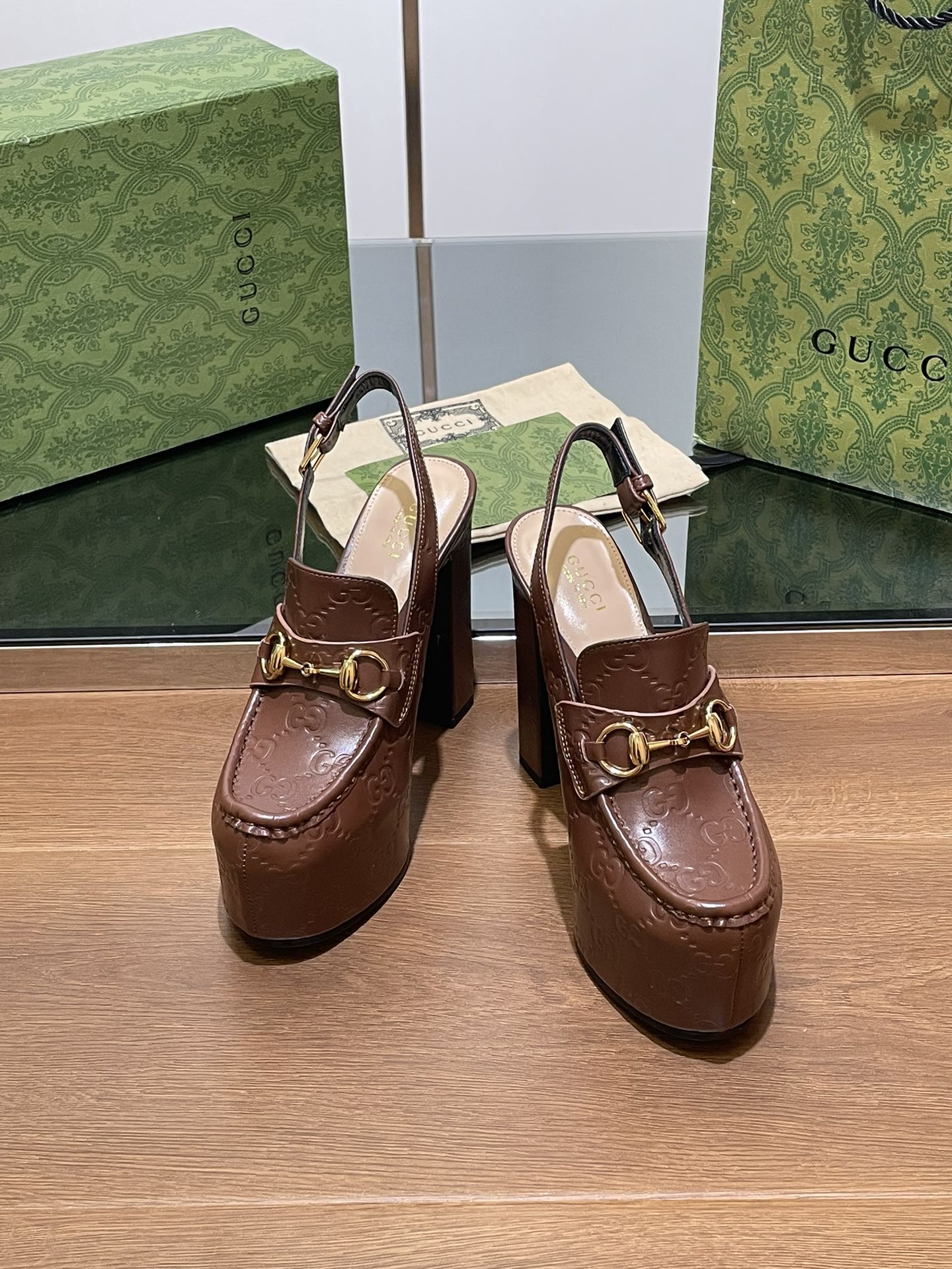 • GG WOMEN'S HORSEBIT PLATFORM LOAFER SLINGBACK IN DARK BROWN EMBOSSED CALFSKIN