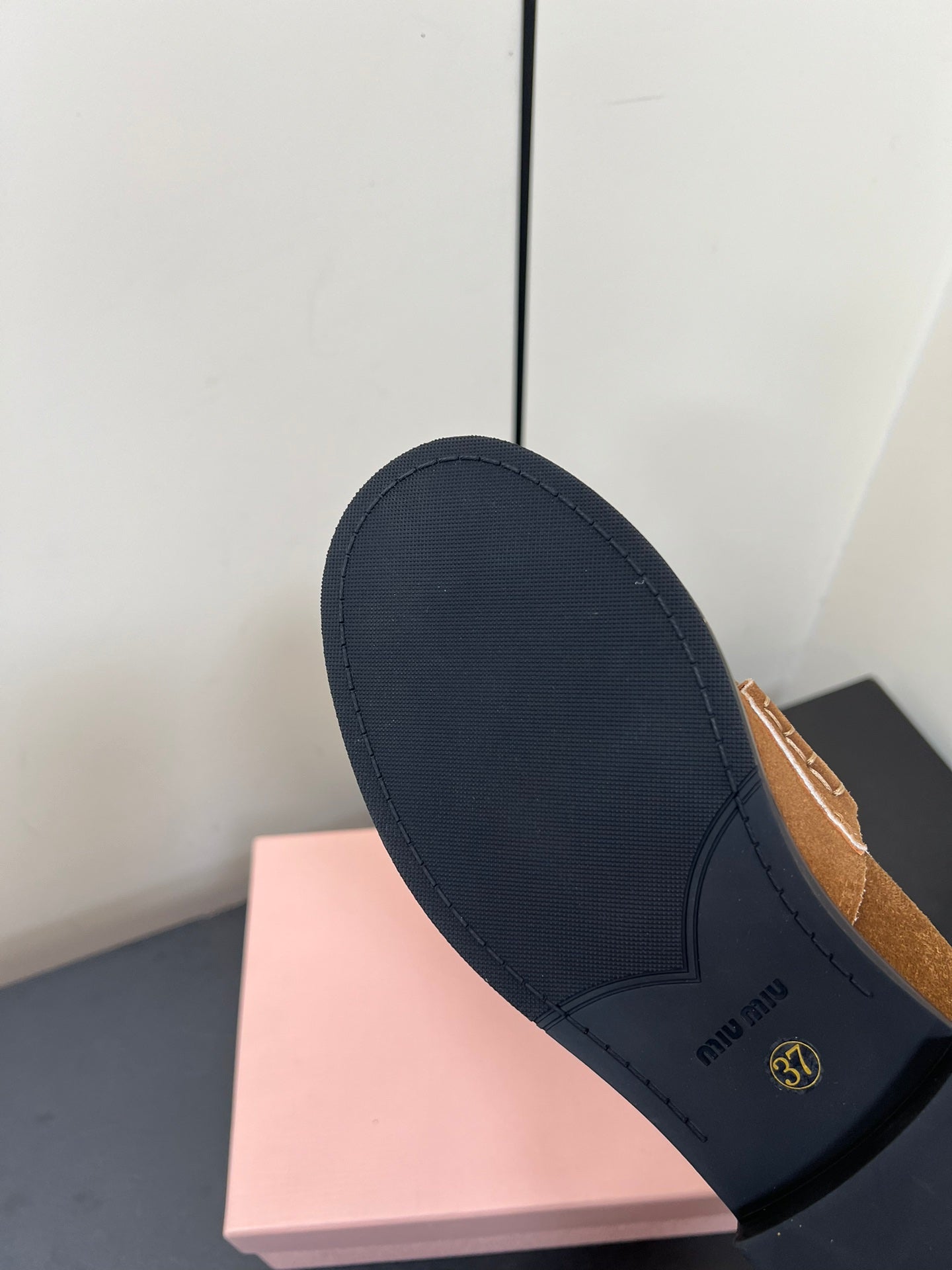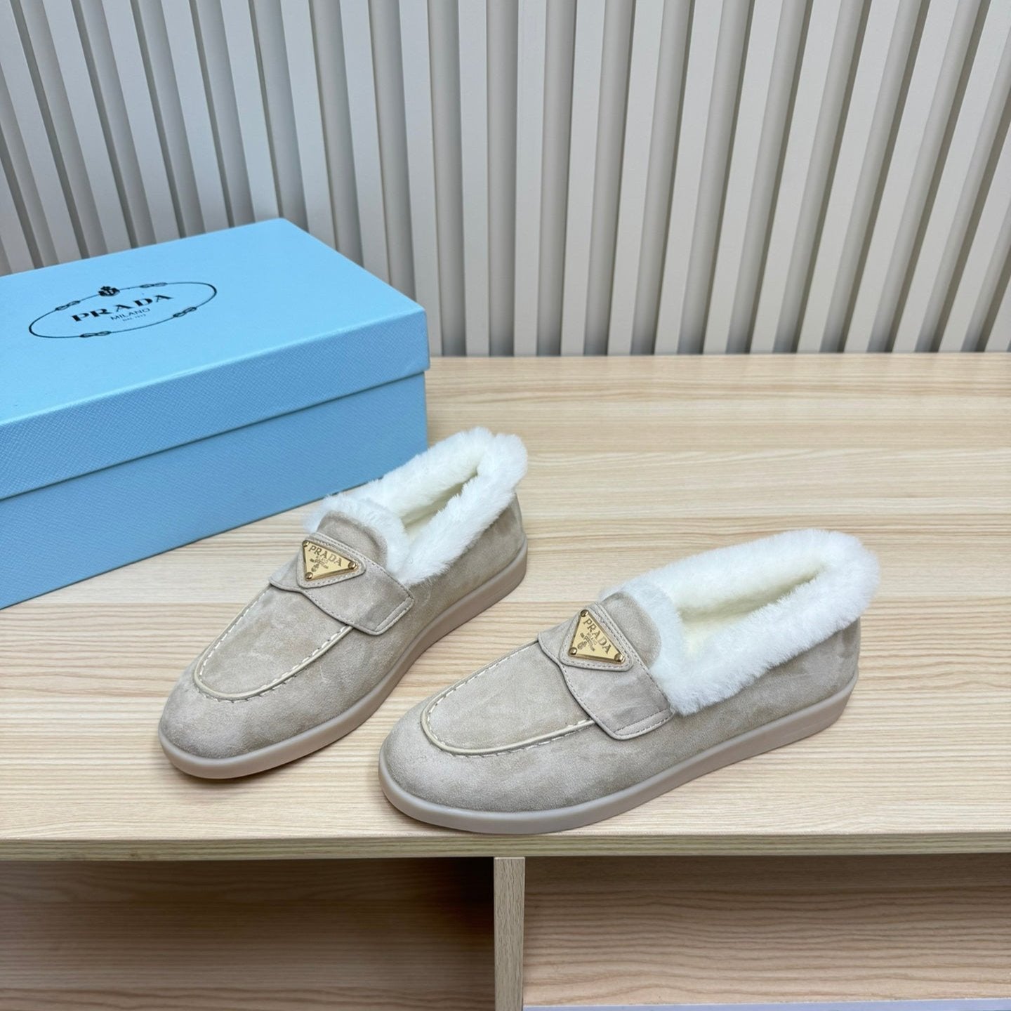 LOAFER IN KHAKI BEIGE SUEDE AND FUR LINING ATTACHED TRIANGLE LOGO