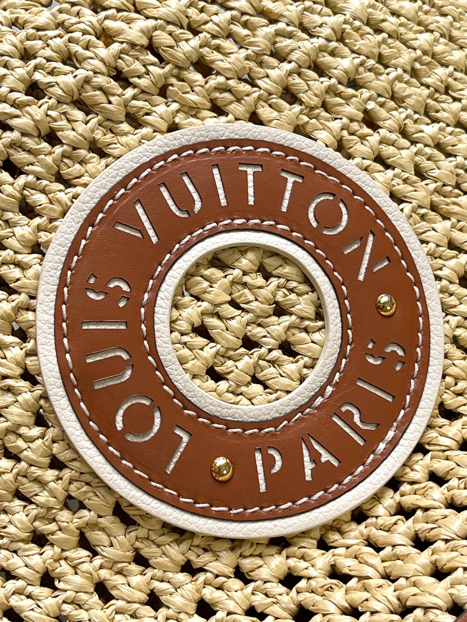 • Material: Crocheted raffia and calfskin trim