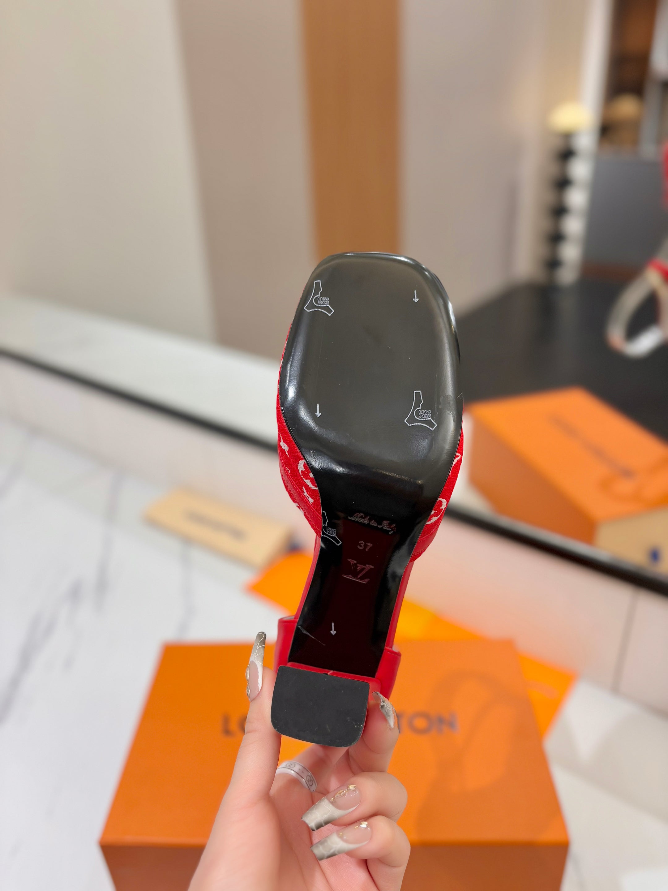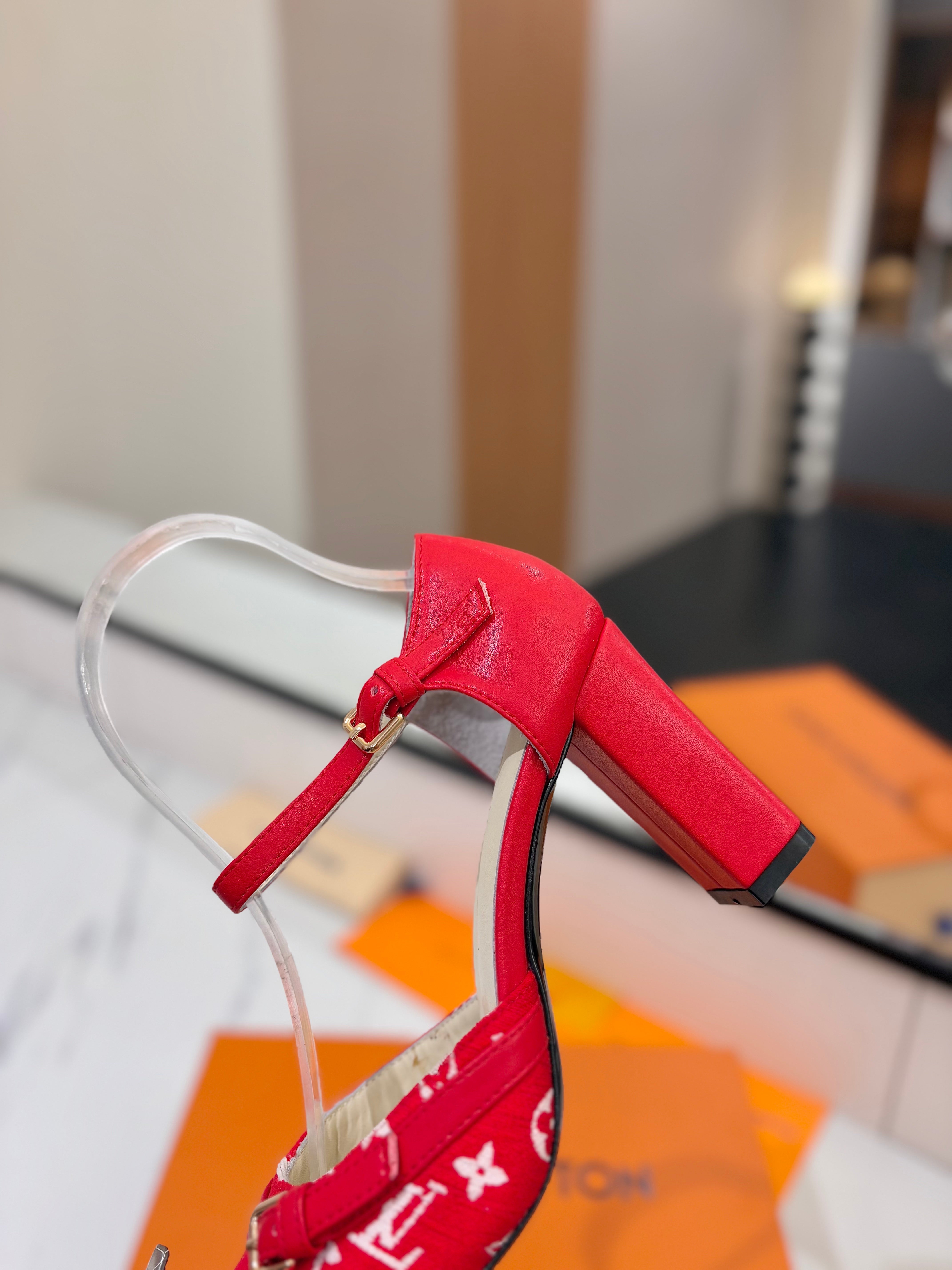 HIGH SANDALS 8 CM IN CHERRY RED MONOGRAM DENIM