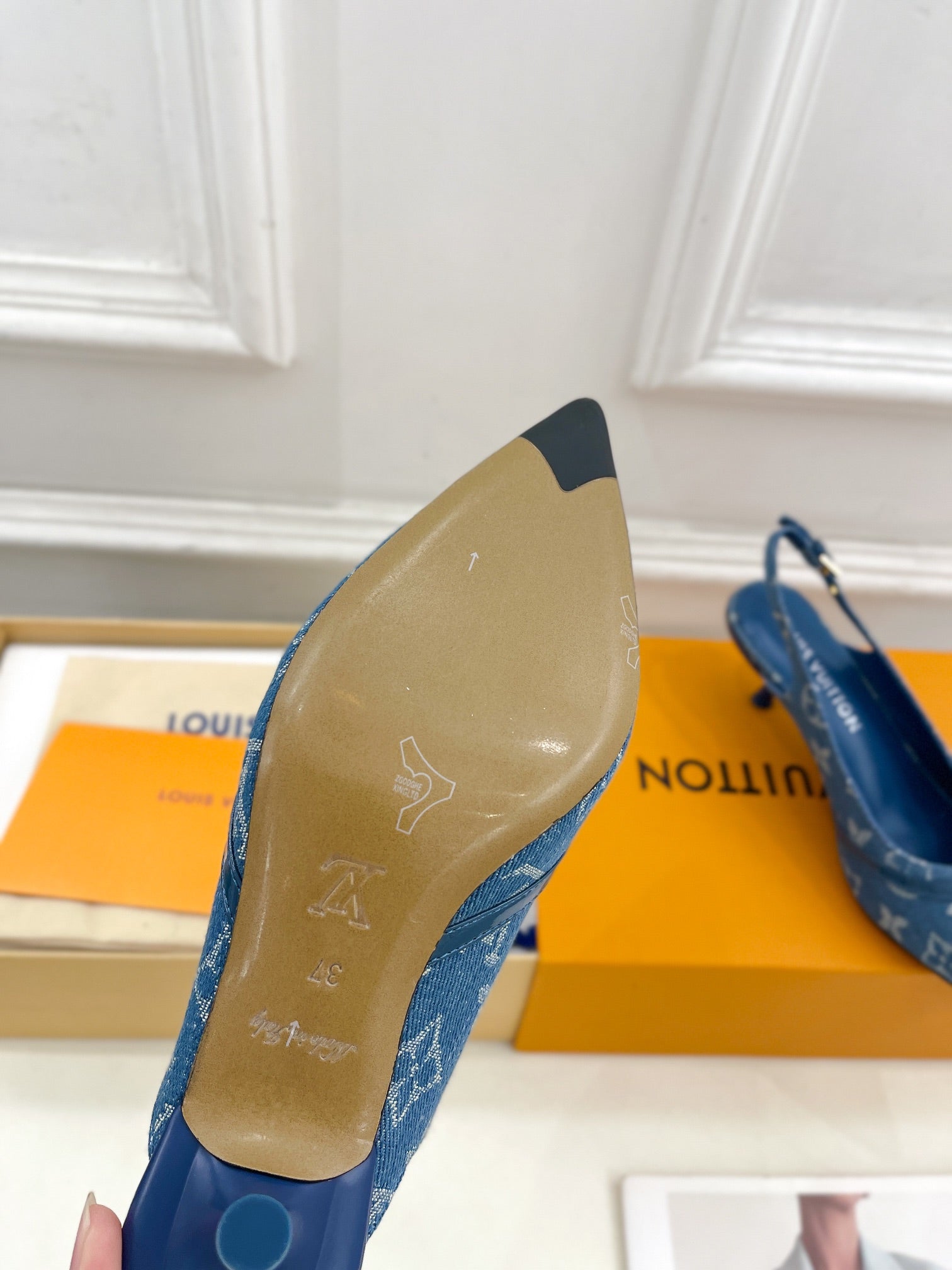 HIGH SLINGBACKS 5 CM IN CLASSIC BLUE MONOGRAM DENIM FABRIC