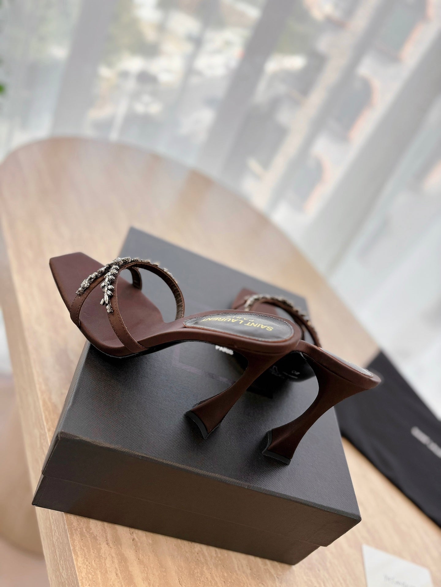 RAV HIGH HEEL 10 CM EMBELLISHED CHOCOLATE BROWN SATIN MULES