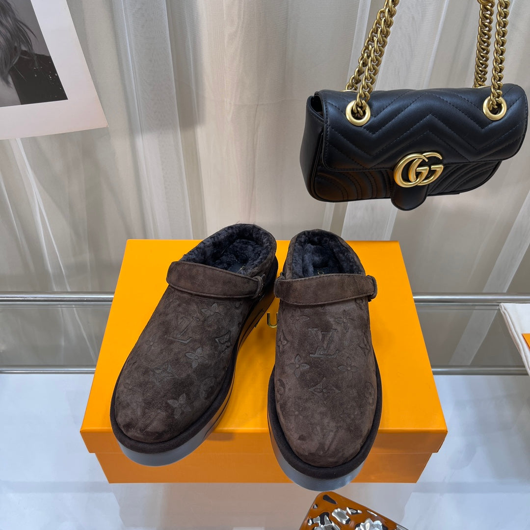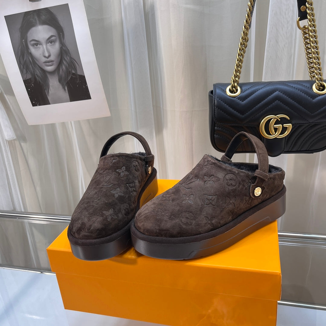 LV WOMEN'S COSY FLAT COMFORT CLOGS IN CHOCOLATE BROWN MONOGRAM SUEDE