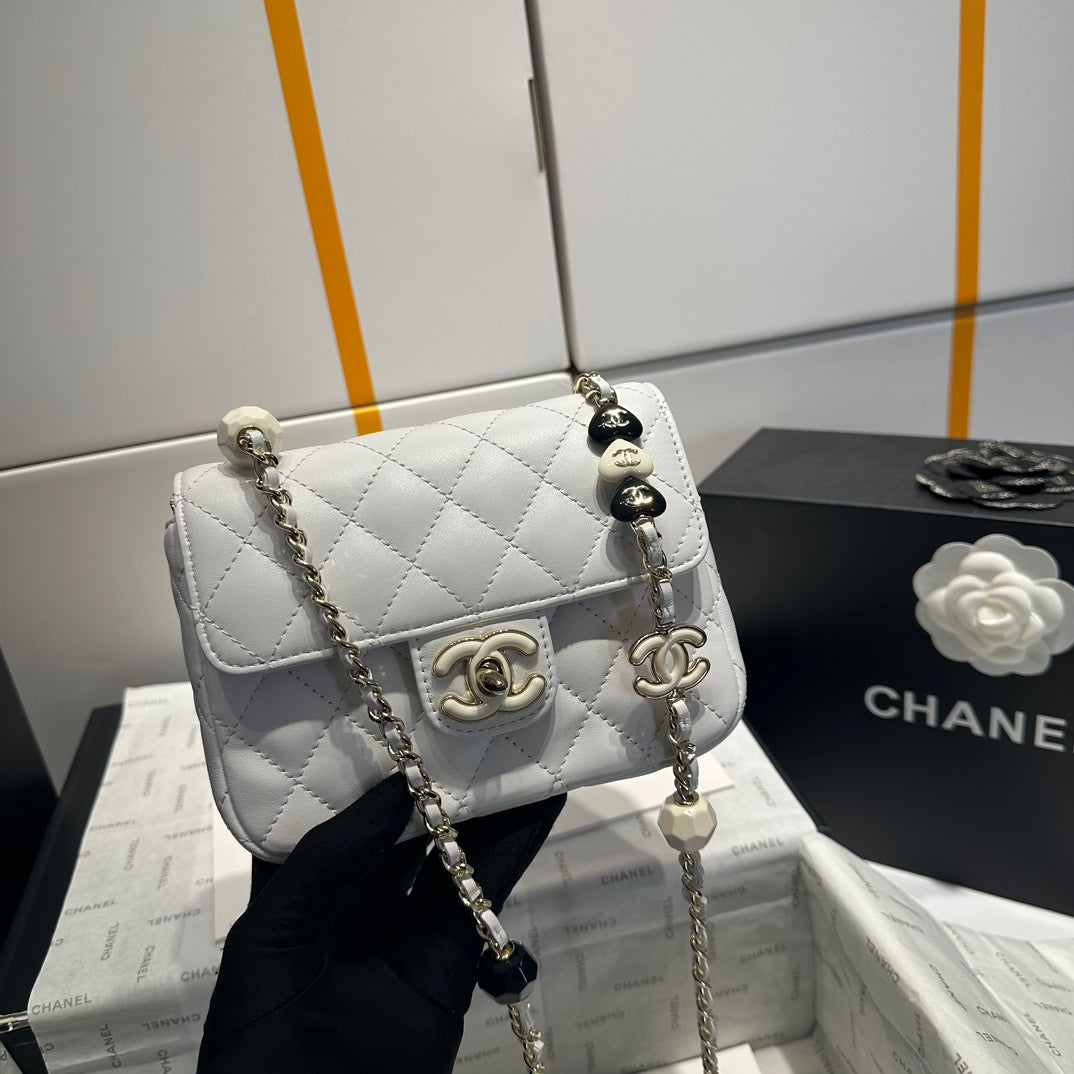 CC MINI 22 FLAP BAG IN BLACK CALFSKIN GOLD HARDWARE WITH PEARL CHAIN