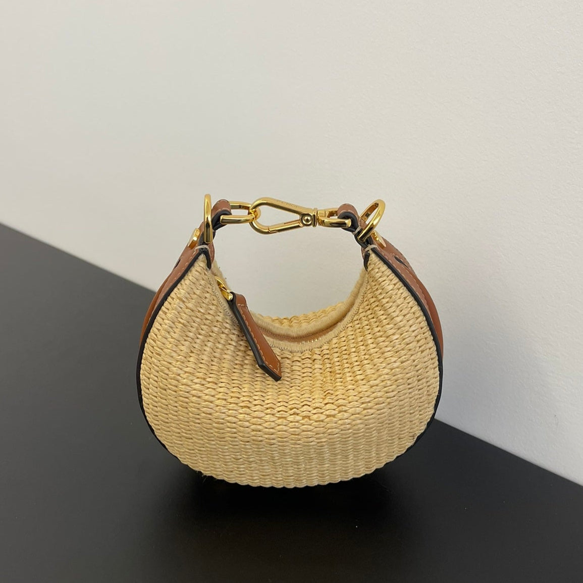 FENDIGRAPHY MINI 16 IN BEIGE STRAW AND BROWN CALFSKIN TRIM GOLD HARDWARE