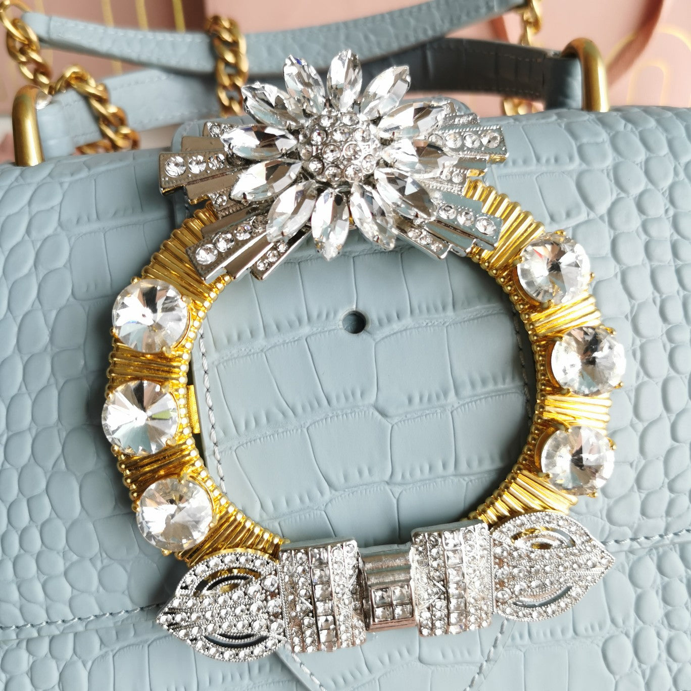 LADY 20 HANDBAG IN CROCODILE PATTERN BLUE MINT CALFSKIN