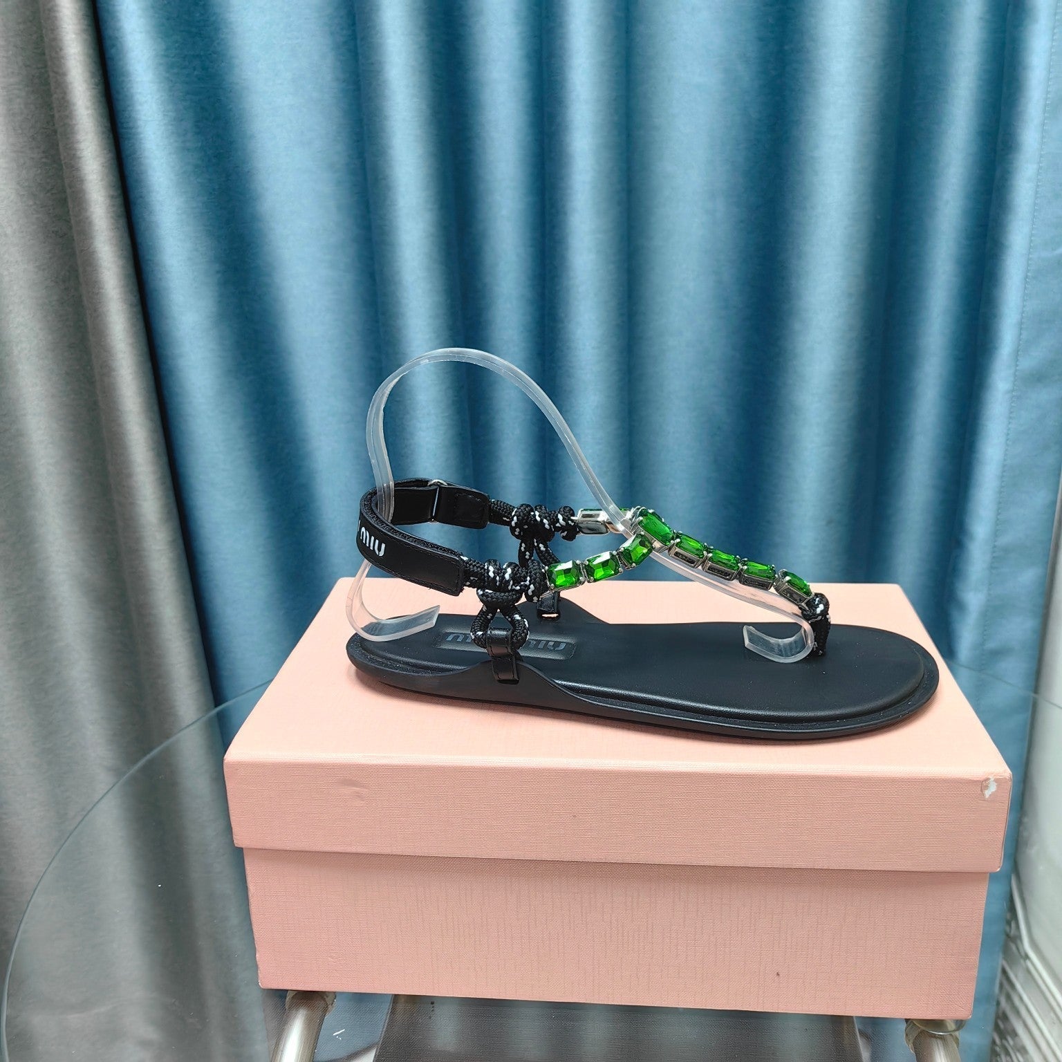 FLIP-FLOPS BLACK COWHIDE WITH CRYSTALS-KELLY GREEN