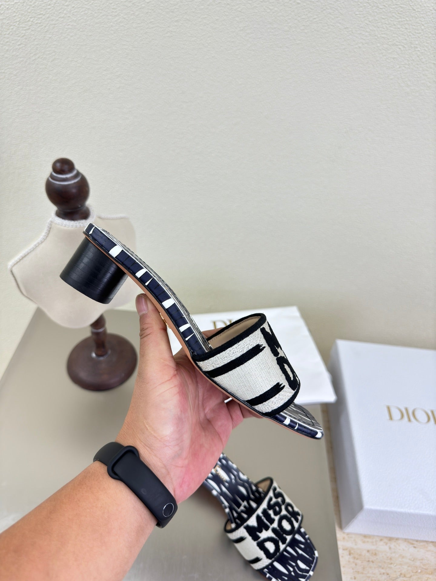 • DWAY HEELED SLIDE EMBROIDERED COTTON AND NAVY BLUE MISS DIOR ALLOVER MOTIF 35 MM